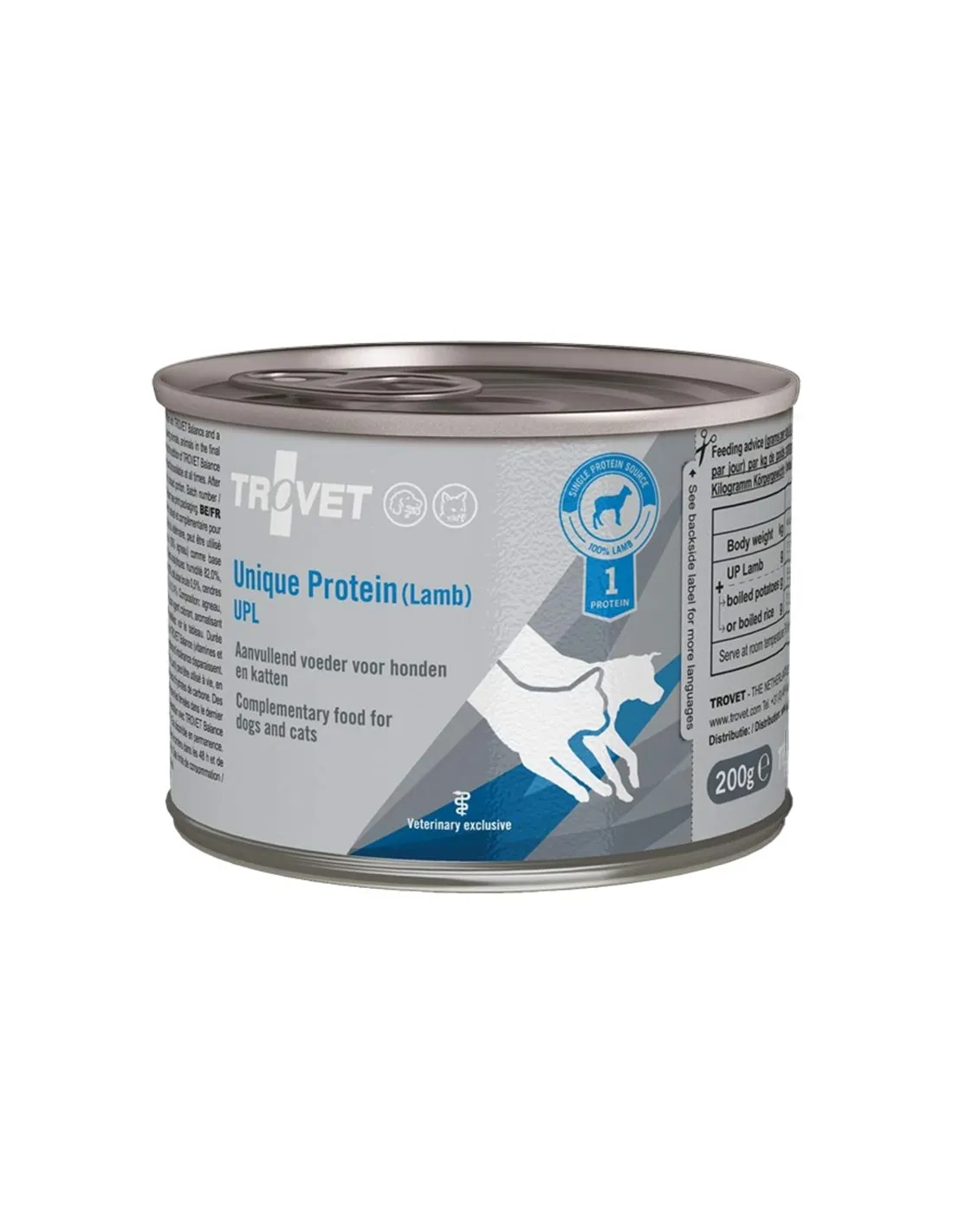 Trovet Unique Protein Lamb is a high quality complementary feed, specifically formulated for dogs and cats that require a particular diet. This wet food is characterized by the presence of lamb as the only source of protein, making it ideal for animals with suspected food allergies or intolerances. The 200 gram version is practical and suitable for satisfying the nutritional needs of animals of different sizes.