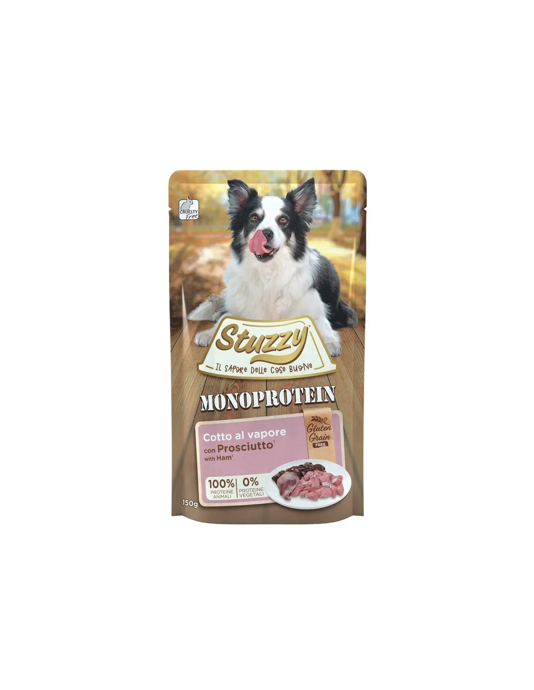 Stuzzy Monoprotein Prosciutto is a complete food for adult dogs that guarantees high digestibility and an irresistible taste thanks to its only animal protein source: ham. Steam cooking preserves the nutritional qualities of the pig, making each 150g meal a healthy and balanced meal for your four-legged friend. This product is ideal for dogs with food sensitivities or for those looking for a simple and natural diet.