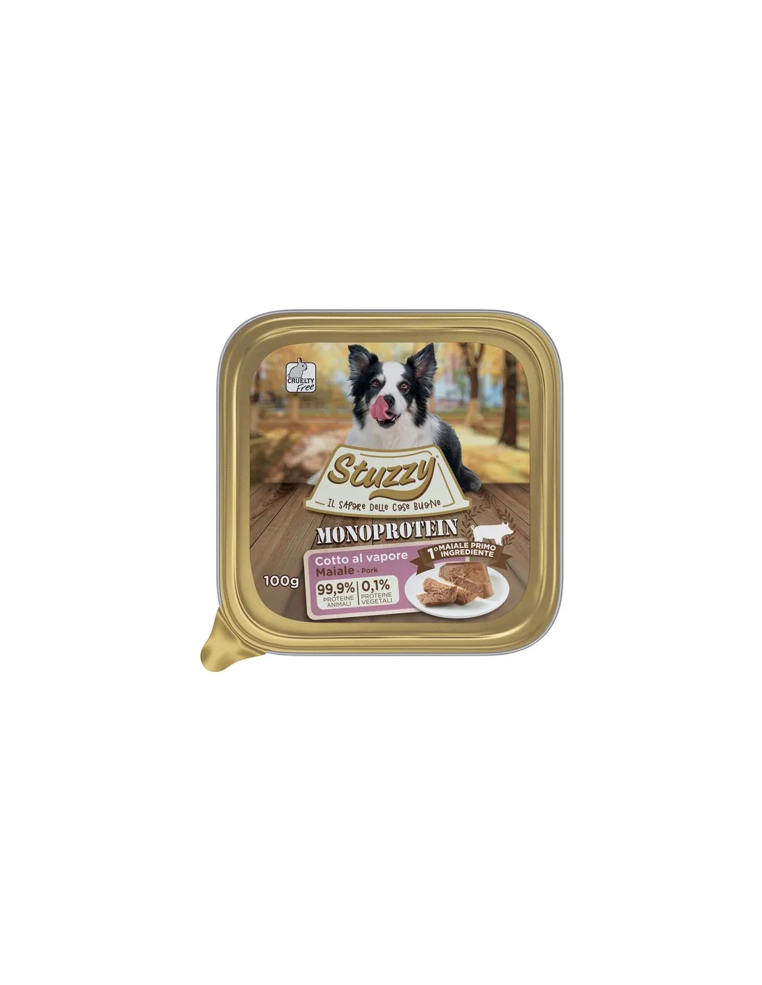 Stuzzy Pork Monoprotein is a complete and delicious food for your adult dog, presented in a practical 100g tray. This product stands out for its monoprotein formula, with pork as the first ingredient and sole source of animal proteins, ensuring high digestibility and reducing the risk of food allergies. Steam cooking preserves the nutritional qualities and authentic taste of the meat, making every meal a moment of pure pleasure for your faithful four-legged friend.