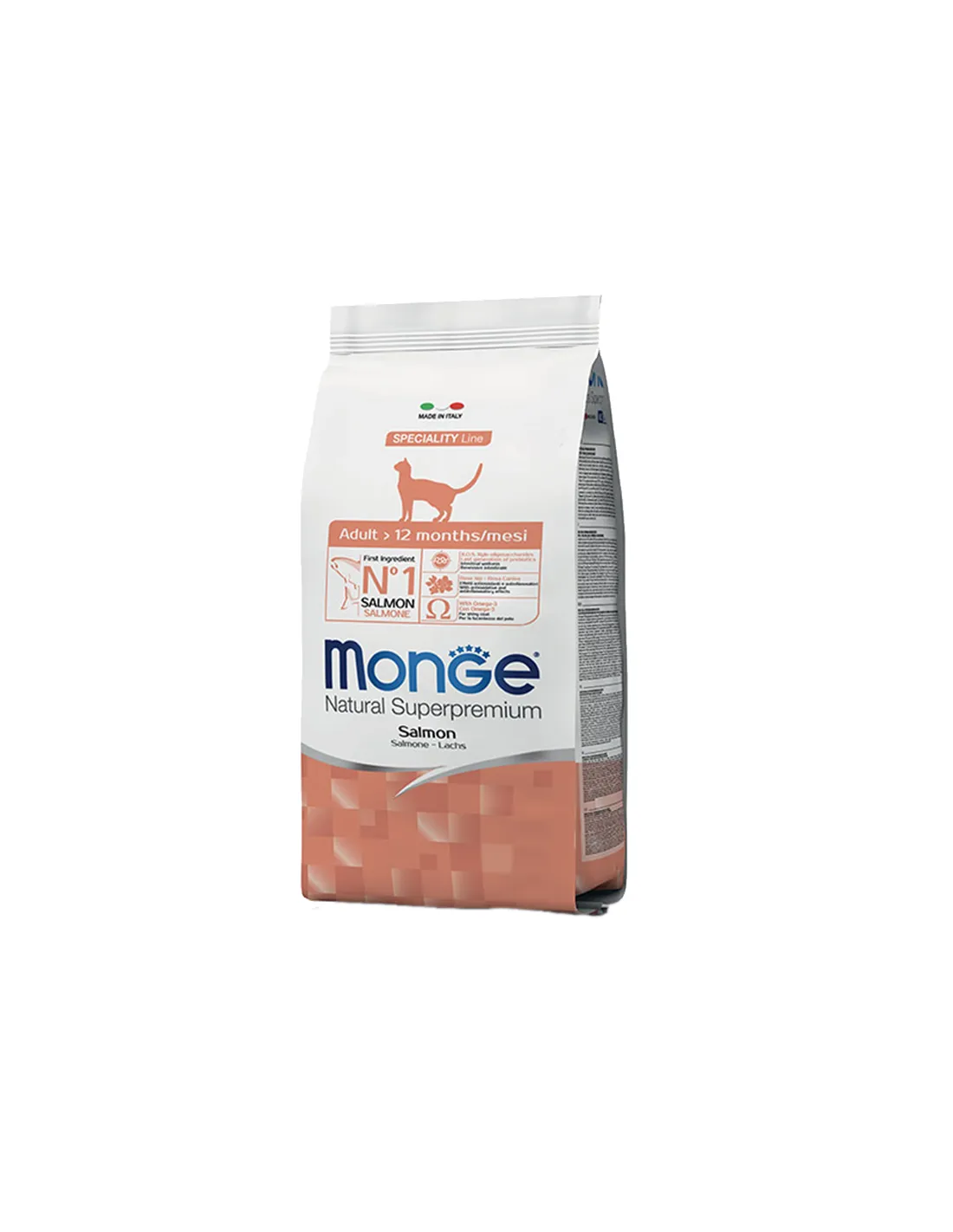 Monge Natural Superpremium Adult Salmon is a complete and balanced food for adult cats, formulated to meet the specific nutritional needs of these animals. The product is characterized by the exclusive use of salmon as the sole animal protein source, positioning itself as an ideal choice for cats with food sensitivities or for those who prefer the taste of fish.