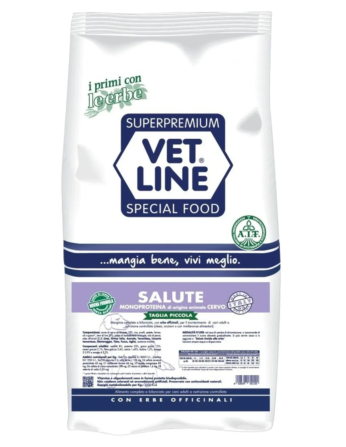 Composition: Dehydrated venison 18%, rice, potatoes, peas, field beans, oils and fats, linseed (3%), dried beet pulp, fish oil, medicinal herbs (Flax, Nettle Leaf, Acerola, Dandelion, Uncaria Tomentosa, Savory, Thyme, Fucus, Garlic), mineral substances.