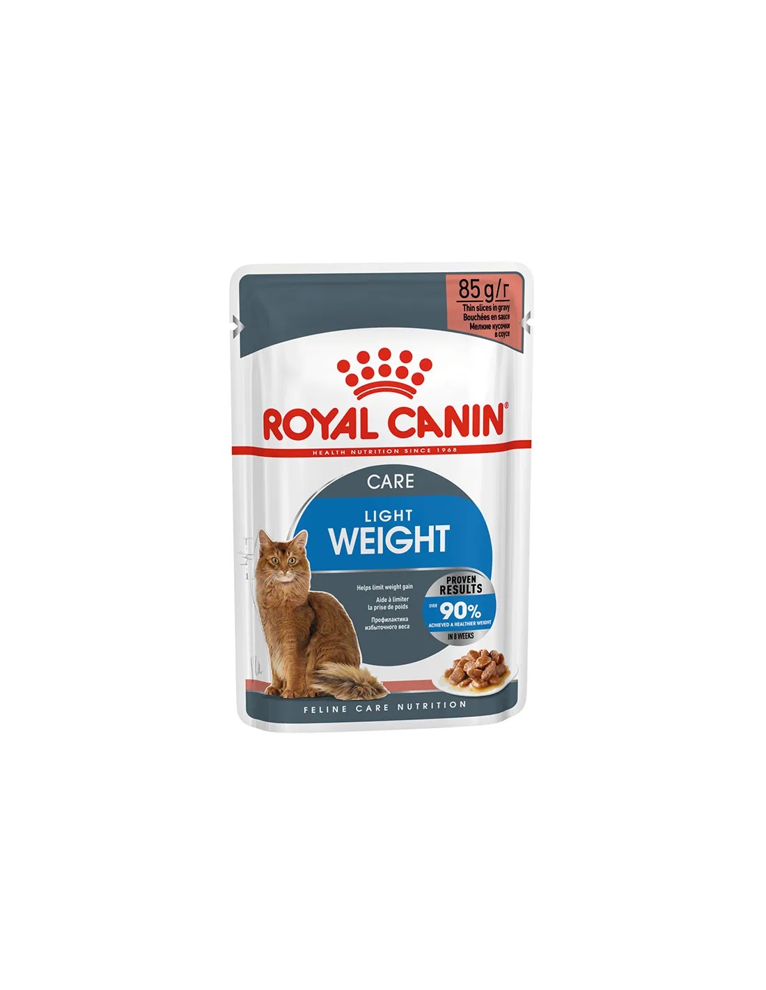 For an adult cat weighing 4 kg, the recommended daily ration is 3 and 1/2 sachets if fed exclusively with "Fcn wet care ultra light". If you opt for a mixed diet, we recommend feeding 1 sachet in combination with 43 g of ROYAL CANIN Feline Light Weight Care kibble. It is important to adapt the amount of food to your cat's specific needs, taking into account its activity level, age and health conditions.