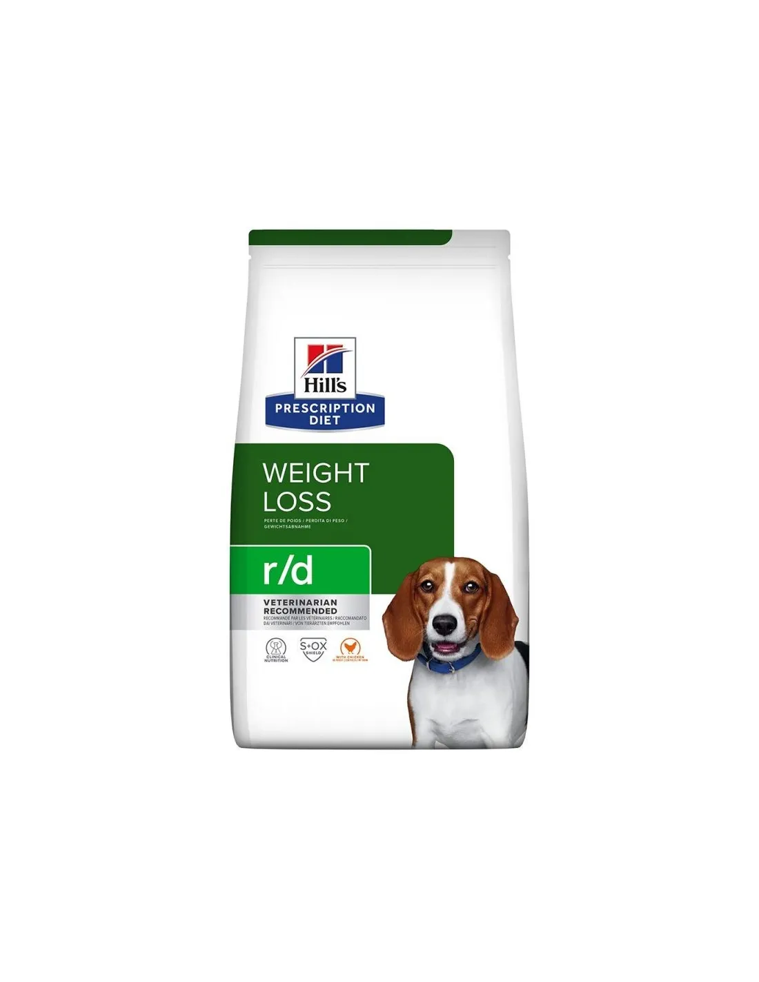 Hill's Prescription Diet R/D is indicated for dogs who need to lose weight. It can be used as part of a weight management program under the supervision of a veterinarian. This product is suitable for dogs of all breeds and sizes.