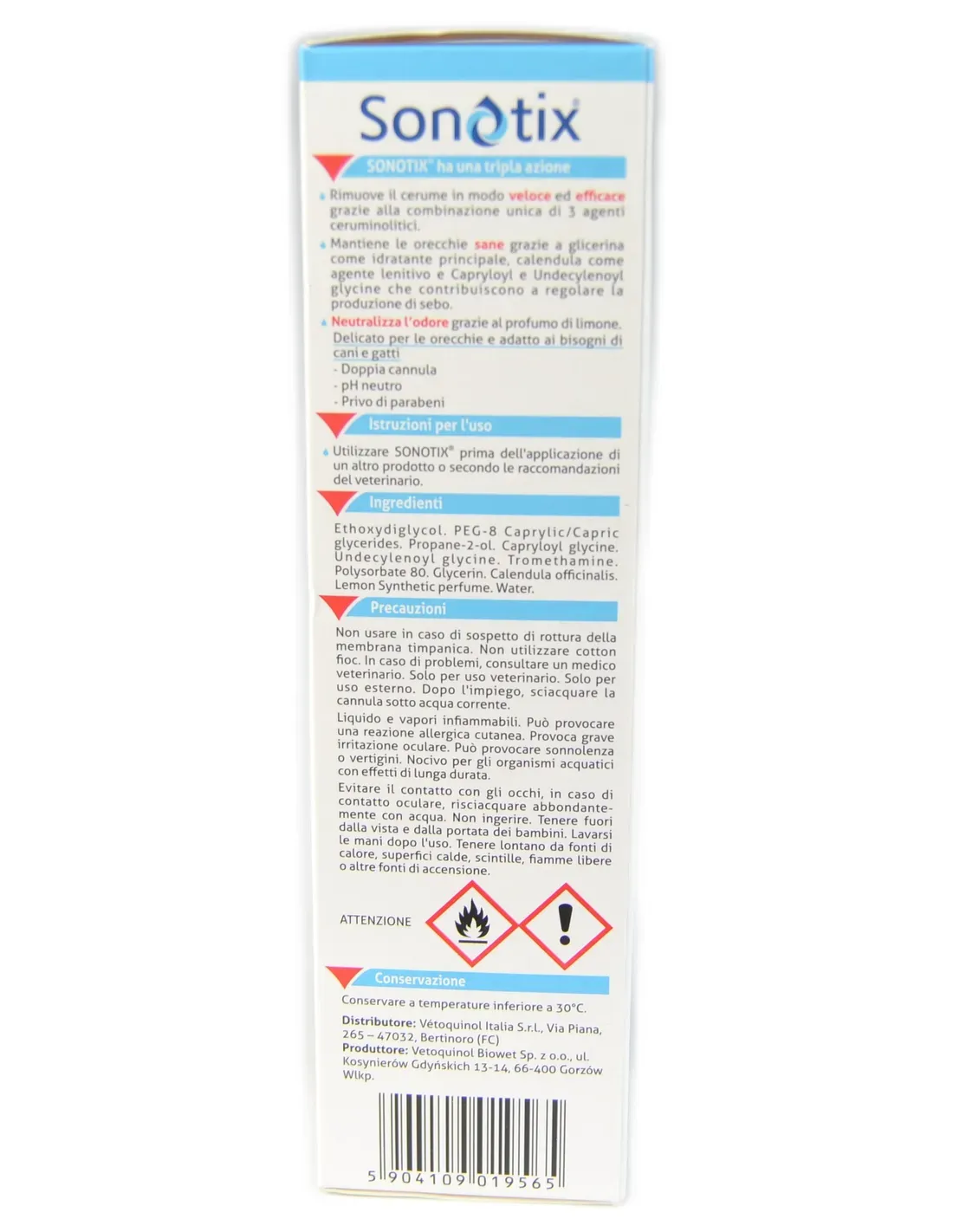 Deep cleaning of the ear canal before applying another product or according to the recommendations of the veterinary surgeon. The complete sonotix formula provides a triple action: removes earwax quickly and effectively thanks to the unique combination of 3 ceruminolytic agents; keeps ears healthy thanks to glycerin as the main moisturizer, calendula as a soothing agent and capryloyl and undecylenoyl glycine which help regulate sebaceous secretion; neutralizes the odor thanks to the lemon scent.