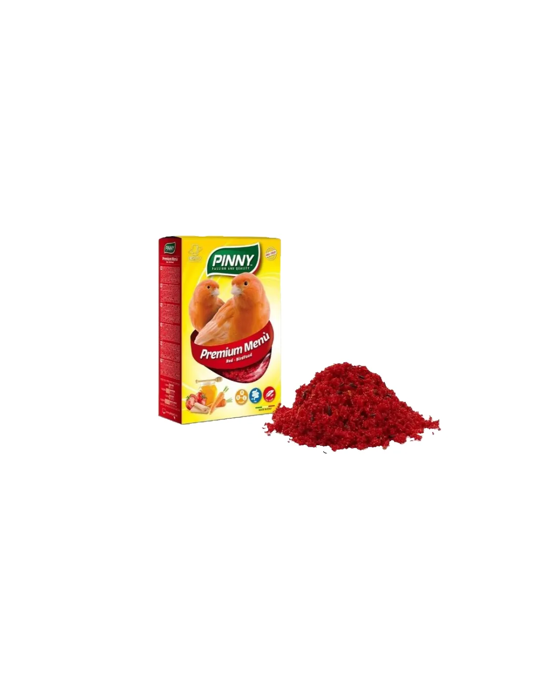 The "Pinny PREMIUM MENU Red birdfood" and the "Pinny PREMIUM MENU fruits birdfood" are suitable for the daily feeding of canaries, budgies and exotic birds. These feeds are enriched with essential vitamins and minerals that help keep birds healthy. Their balanced formula supports the immune system and contributes to maintaining bright and healthy plumage.