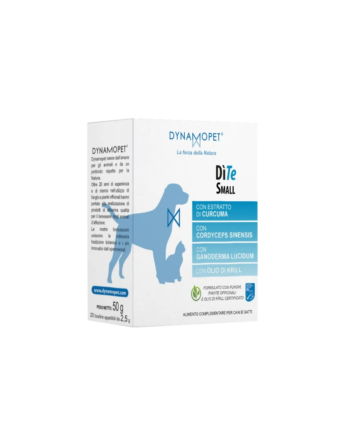 The DìDERMO SMALL product is composed of water, maltodextrin, vegetable glycerol, blackcurrant, silver lime and walnut bud extracts, 100% pure krill oil, dried Polyporus umbellatus mushroom, marine zooplankton meal (Krill), and a selection of nutritional, sensorial and technological additives. These ingredients were chosen for their effectiveness in supporting the health of animals' skin and fur.