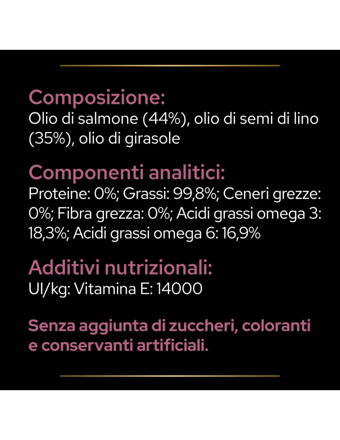 Composition: Salmon oil (44%), Linseed oil (35%), Sunflower oil.