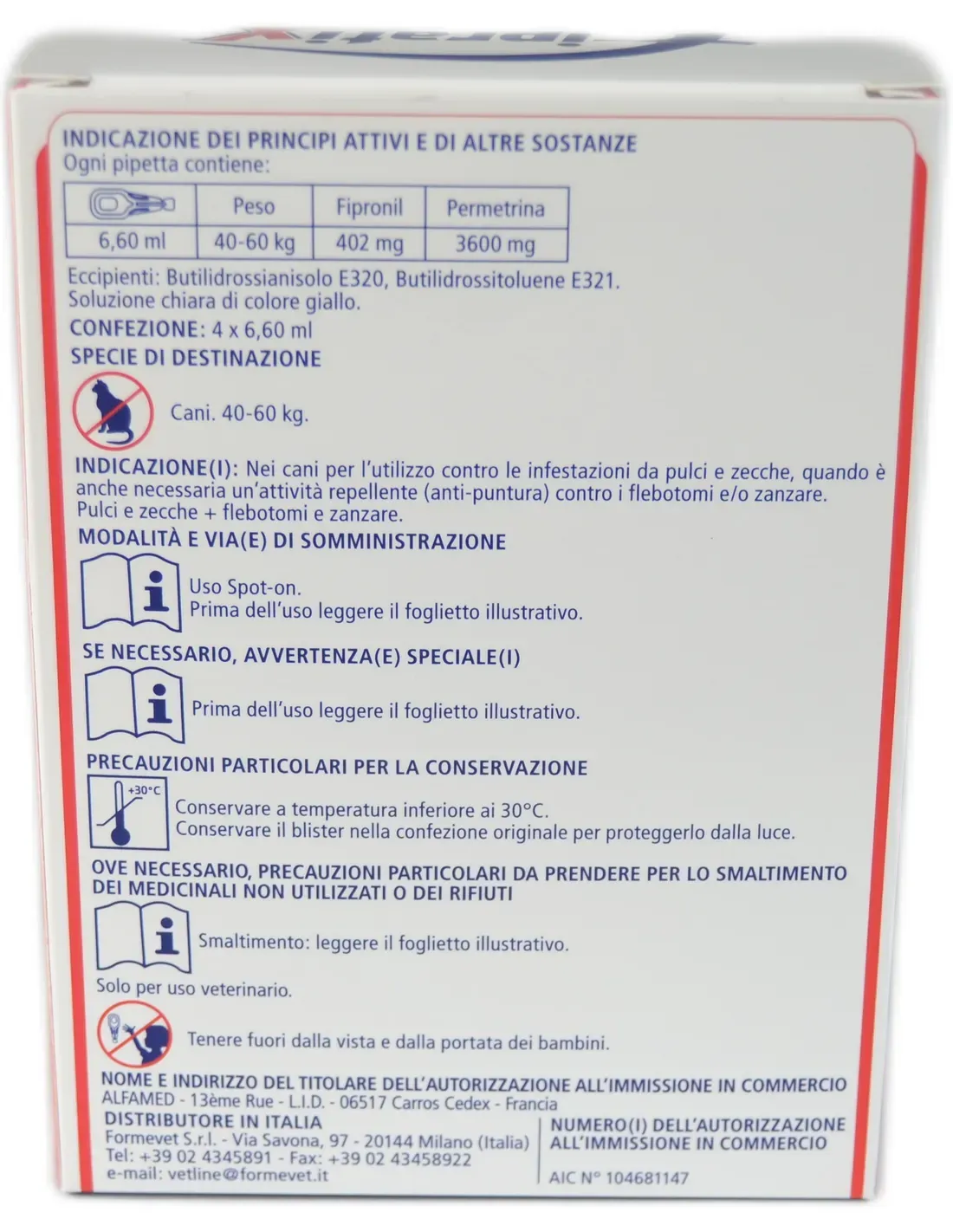 Fipratix dogs 40 - 60 Kg 4 pipettes to be used against flea and/or tick infestations, when a repellent (anti-bite) activity against sandflies and/or mosquitoes is also necessary.