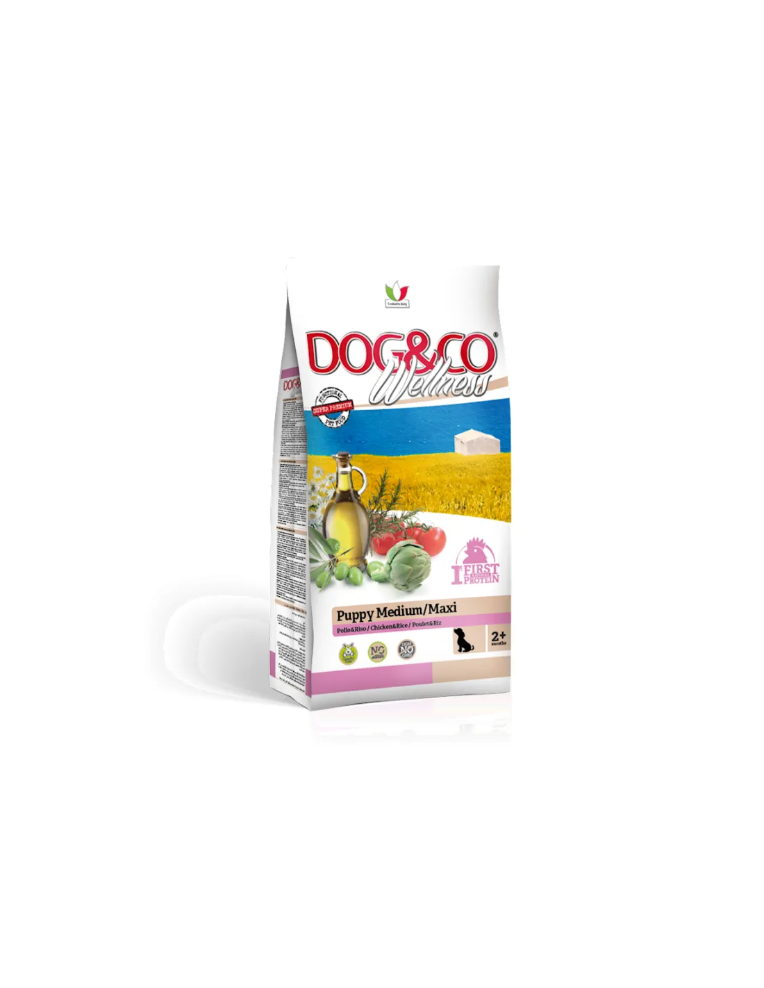 The product "Crockex Wellness Puppy Medium Maxi Chicken Kg 12" is a complete dry food, specifically formulated for medium and large sized puppies. This food is enriched with high quality ingredients such as chicken and rice, as well as Mediterranean components selected for the puppy's well-being.