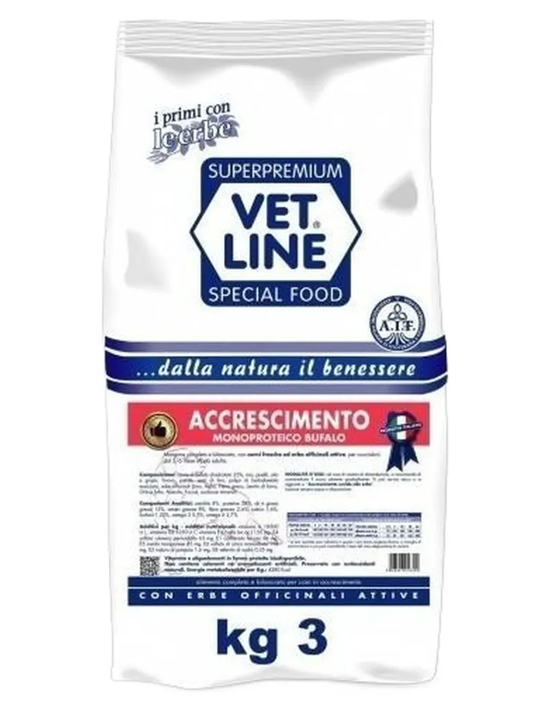 Complete and balanced food, with fresh meat and active medicinal herbs, for puppies from 5/6 months of age up to adulthood. monoprotein buffalo food.