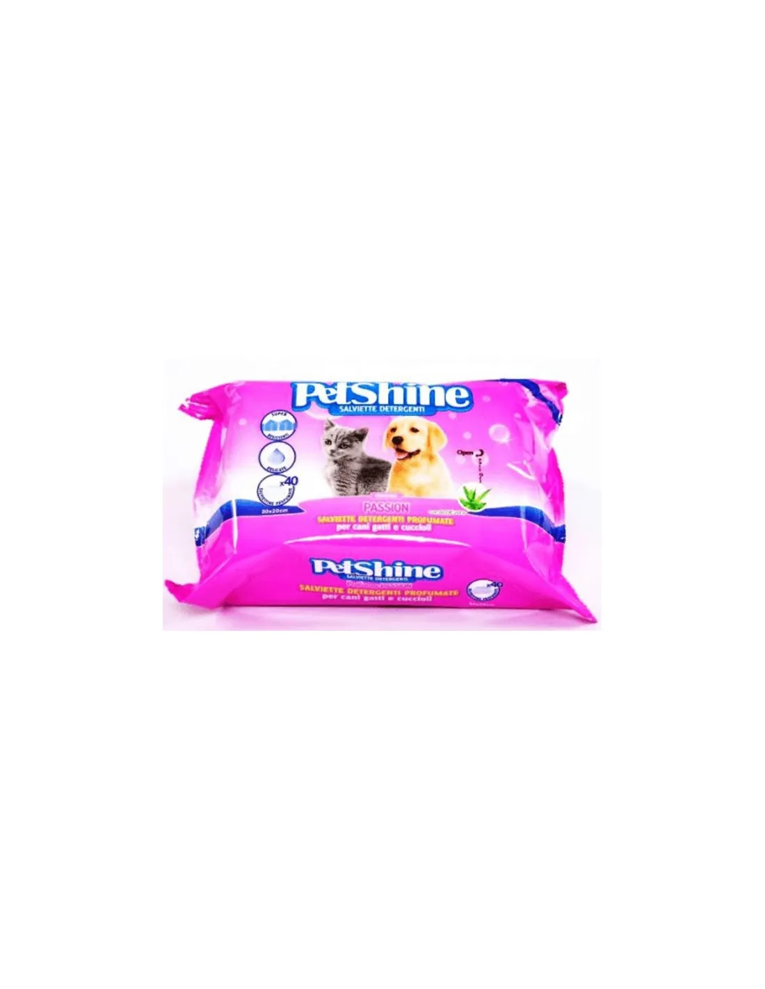 Petshine wipes are soaked in an alcohol-free scented solution, which not only cleans but also deodorizes the animal's fur, leaving it pleasantly scented. Their gentle formula is enriched with chlorhexidine, an antibacterial agent that helps keep skin healthy and prevent irritation and infections. They are ideal for cleaning paws after a walk, to refresh the fur between baths or simply for a quick clean when you are away from home.