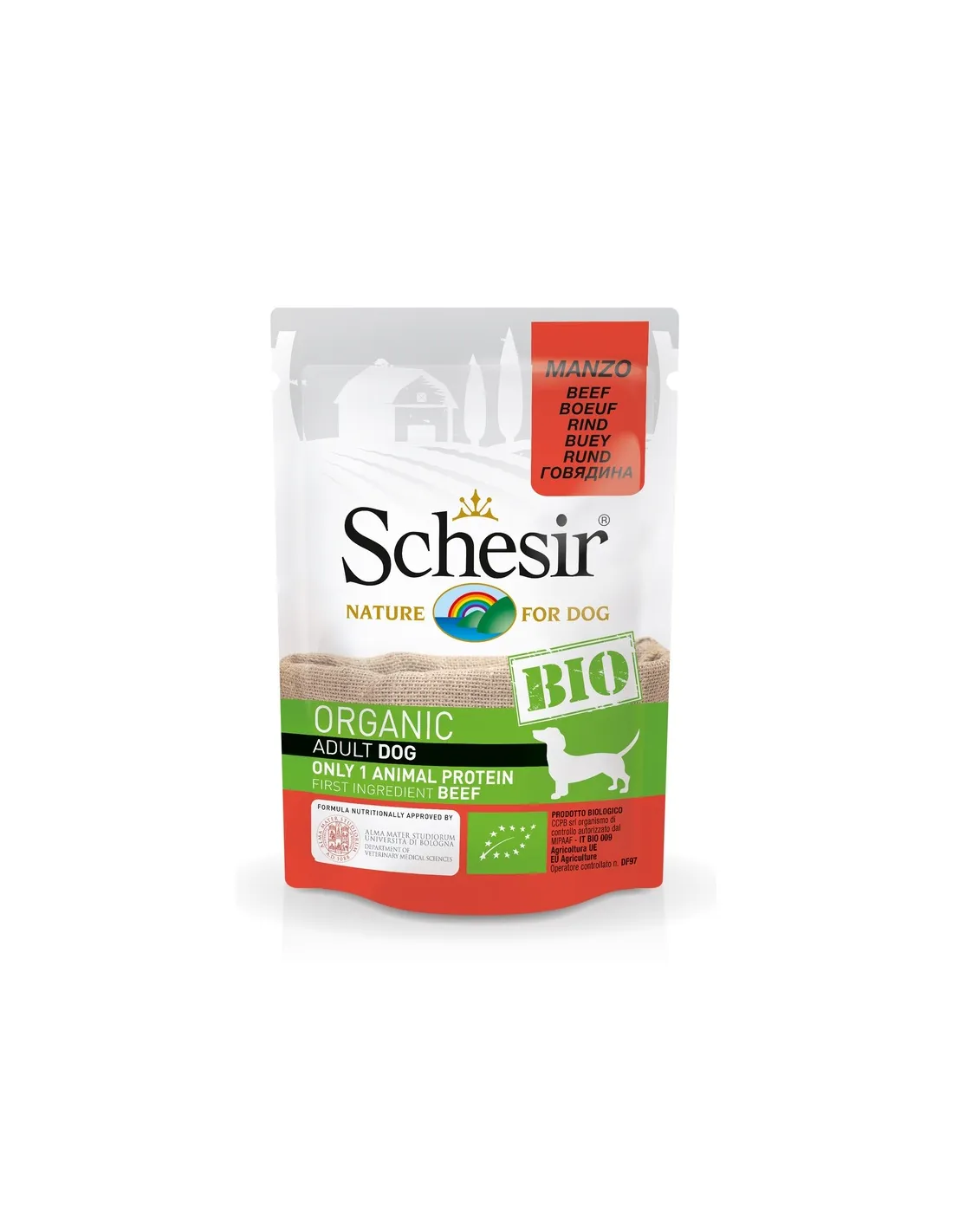 Schesir BIO Dog 85g is a high-quality wet food for adult dogs that offers a delicious and nutritious gastronomic experience. This select beef pate is made without the addition of grains, making it an ideal option for dogs with food sensitivities or those following a grain-free diet. Each sachet contains 85 grams of organic wet food, conveniently packaged to ensure freshness and ease of service. The multiple includes 16 sachets, for a total of 1.36 kg of complete, balanced and ready-to-use food.