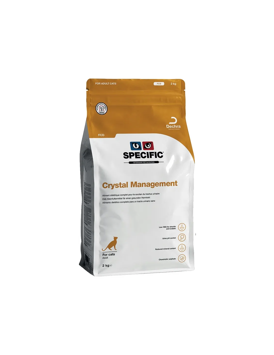 Specific FCD Crystal Management is a veterinary diet indicated for cats with struvite stones or lower urinary tract disorders. Its formulation induces a urinary pH lower than 6.4, promoting the dissolution of existing crystals and preventing their reappearance. Enriched with high levels of Omega-3 (EPA and DHA) from fish, this food supports skin and joint health, helping to maintain lean body mass. Thanks to the moderate sodium content, it is also ideal for prolonged use.