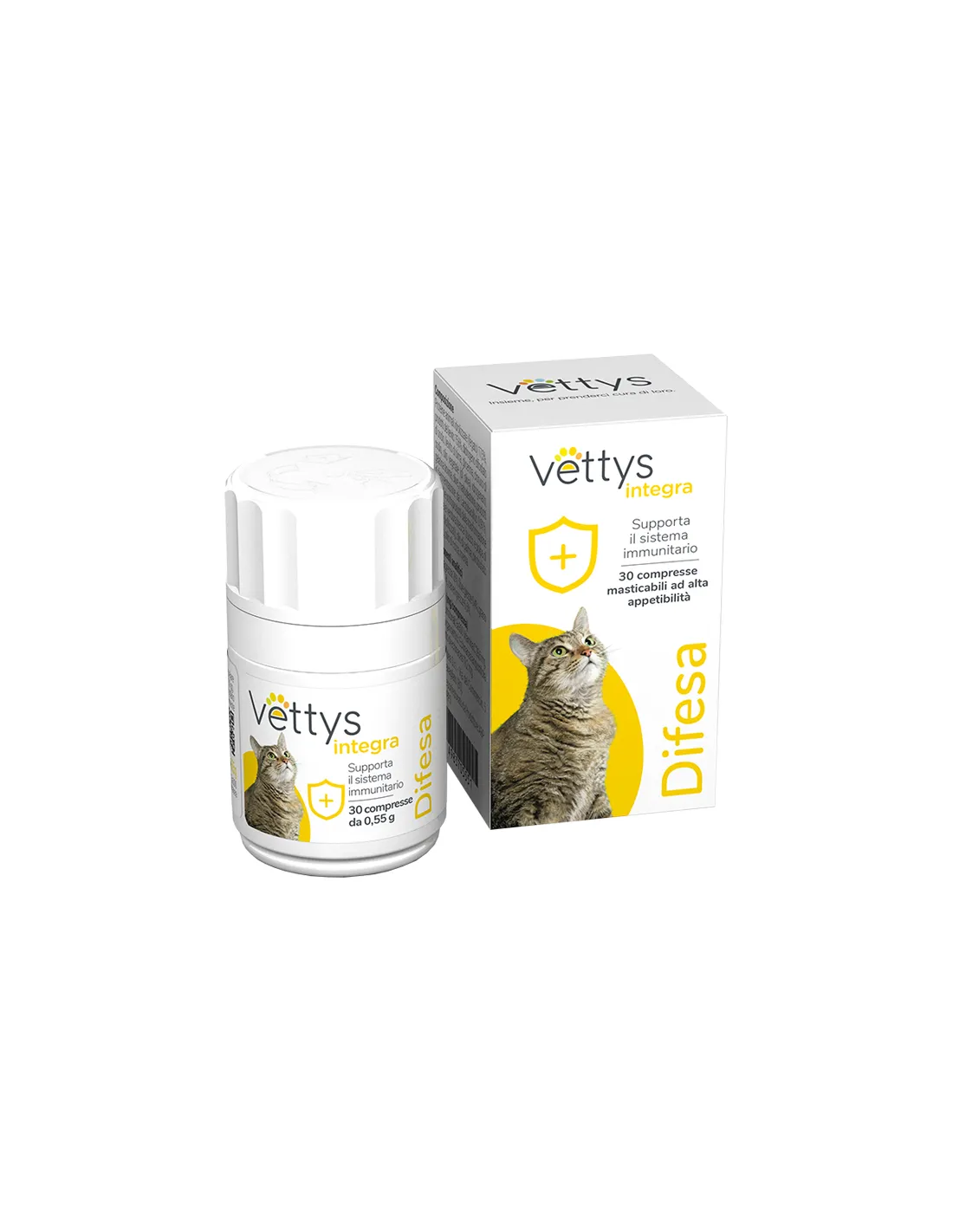 Vettys Integra Difesa Gatto is an immunostimulant supplement for cats, made in the form of chewable tablets. This multivitamin complementary feed is designed to support the correct functioning of the cat's immune defenses. The product is indicated for the stimulation of the immune system and contains natural Echinacea extract, selected and highly purified yeast derivatives, fermentation products such as tyndallized lactobacillus, Vitamin C and hydrolyzed animal proteins (liver). It is advisable to always read the label and instructions provided on the product before using it and to seek veterinary advice before using the product if the animal is pregnant. The product must be stored at room temperature, in a cool, dry place, away from heat sources and direct exposure to sunlight.