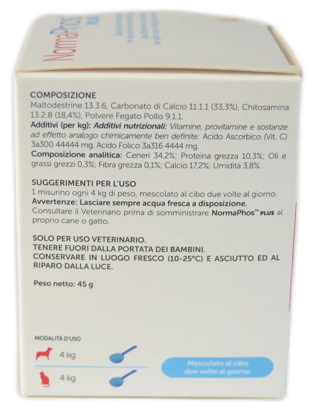 Pharmacross Normaphos Dog and Cat powder 45 g is a complementary food that combines the phosphorus of calcium carbonate (99% purity) and chitosamine (90% purity) with the antioxidant properties of vitamin C (99% purity) and an adequate content of folic acid (99% purity). NormaPhos® PLUS, in association with a renal diet, can help maintain phosphorus in normal ranges other than supporting red blood cell function.