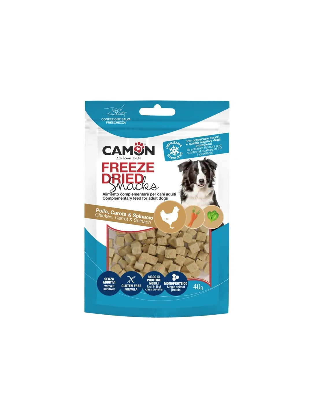 Camon Freeze-dried chicken cubes with carrots and spinach - AE401 is an innovative complementary snack for adult dogs. These freeze-dried chicken cubes undergo a freeze-drying process that preserves the flavors and nutritional qualities of high-quality ingredients such as chicken, carrot and spinach. These snacks contain no additives, are gluten-free and are rich in noble proteins. Being monoprotein, they are also an excellent choice for dogs with food intolerance problems. The package contains 40 grams of product.