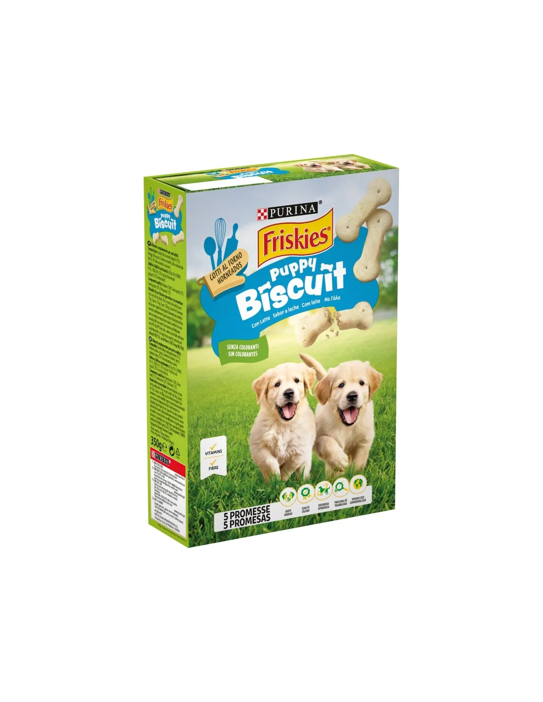 Purina Friskies Snack Dog Puppy with Milk is made from high quality ingredients, selected to guarantee the well-being of your puppy. Among the main ingredients we find: cereals, by-products of vegetable origin, oils and fats, milk and milk-derived products (including 4% milk powder), sugars, minerals.