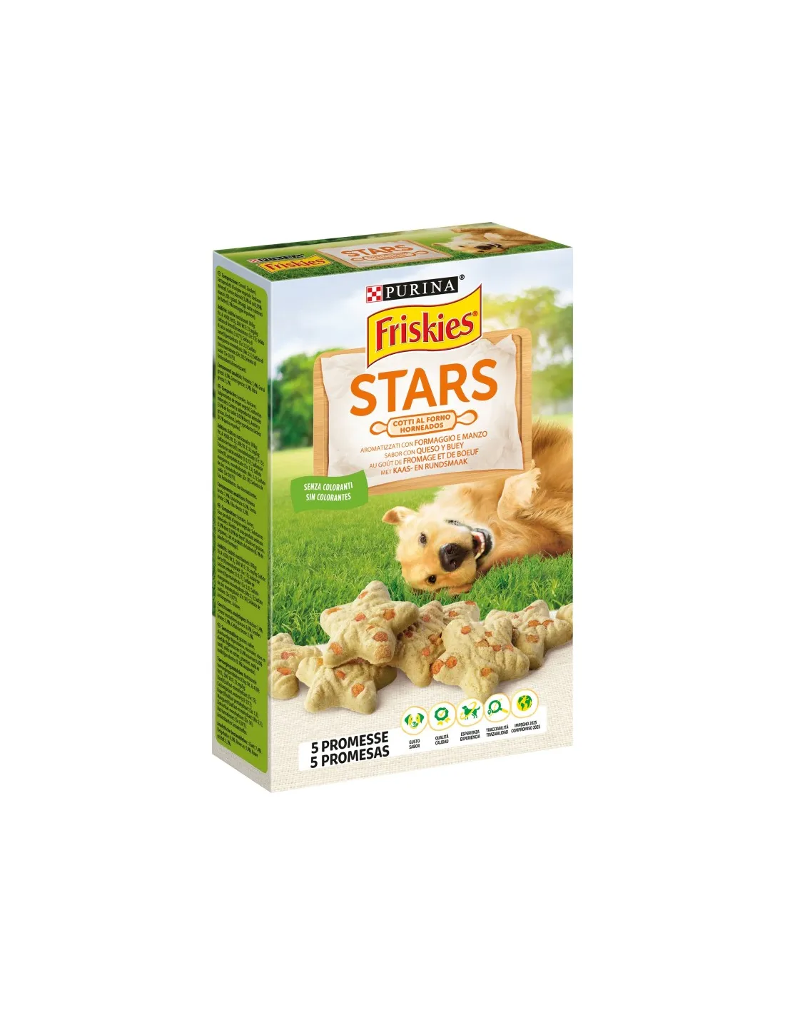 Purina Friskies Stars is a delicious snack for dogs, flavored with cheese and beef. These biscuits are available in 320 g packs, ideal for rewarding your four-legged friend during the day.