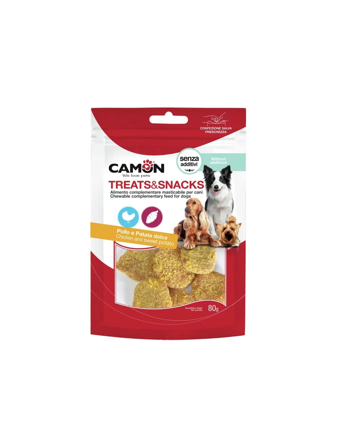 Camon Snack Breaded Chicken and Sweet Potato Medallions are delicious and healthy snacks for dogs, ideal as a reward during training or as a simple snack. Each pack contains 80g of medallions, each with a diameter of 5cm, perfect for dogs of all sizes.