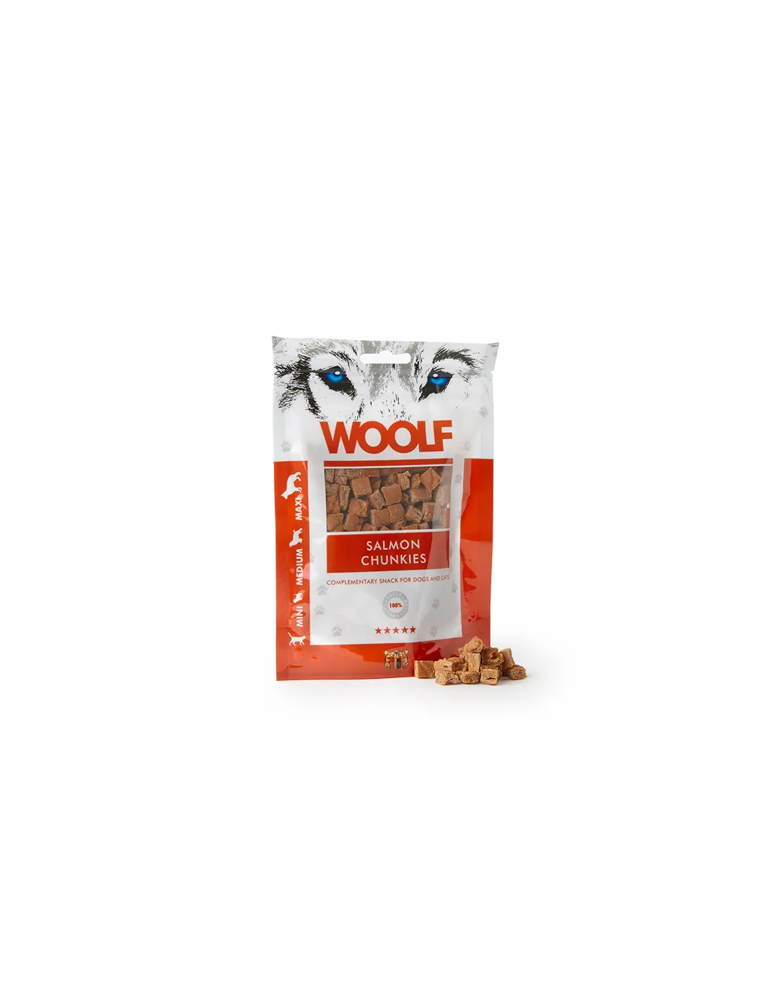 Woolf Soft Salmon Chunks is particularly suitable for dogs of all sizes. Being a single-protein snack, it is also ideal for dogs with food sensitivities or restrictive diets that require limited ingredients. This snack can be used as a reward during training or simply as a tasty treat during the day.