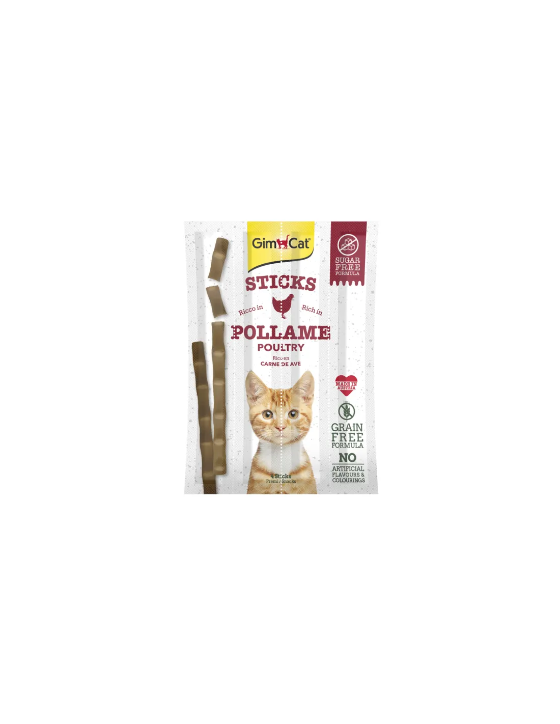 GimCat Chicken Sticks are snacks in meat sticks for adult cats. Each pack contains 4 sticks of 20 grams each, ideal as a reward or snack between meals.