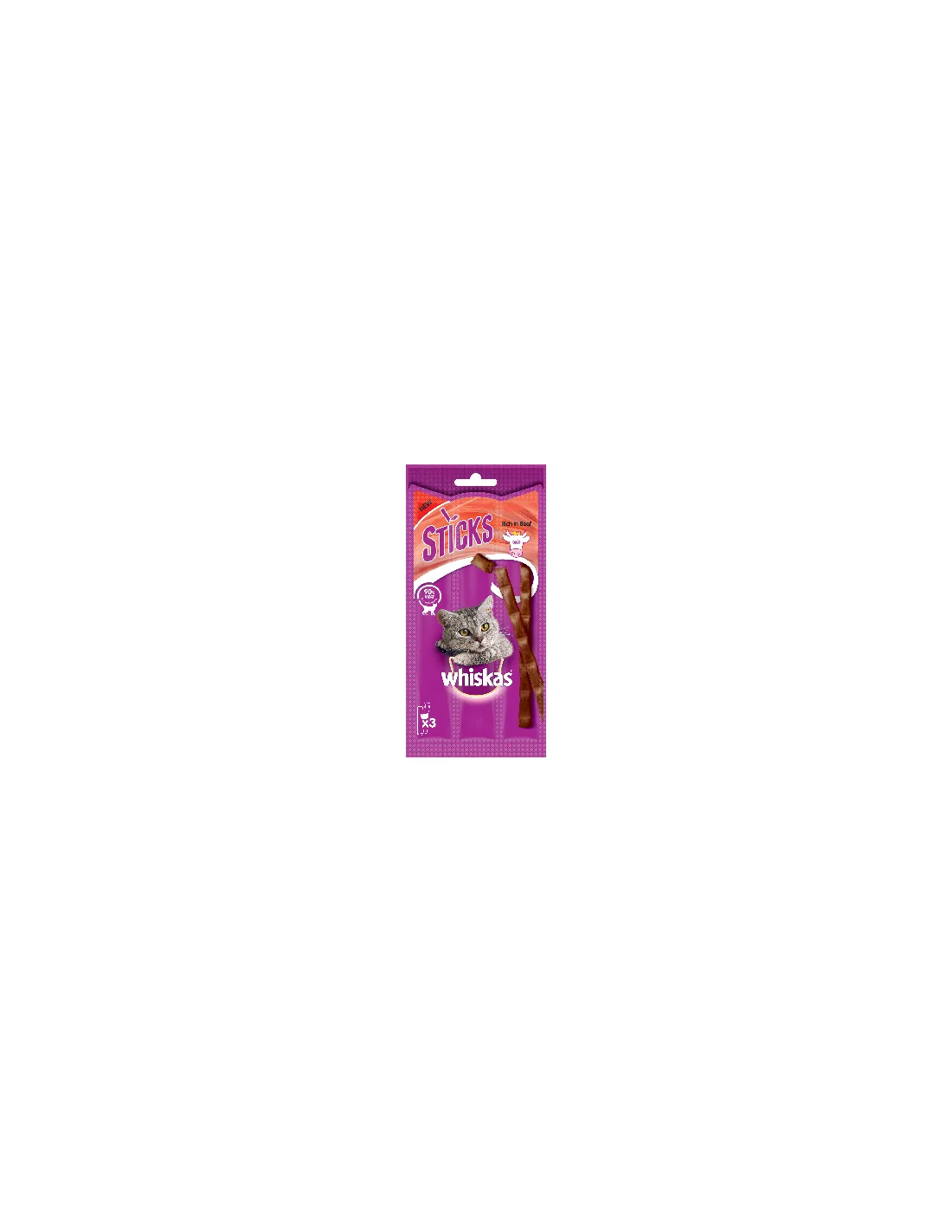 Whiskas® Stick with Beef 18g is an irresistible snack for cats, made up of 80% fresh meat. This snack was specifically developed to be a tasty addition to your feline's main meals. Each stick is individually packaged to ensure maximum freshness and flavor every time it is opened. It is important to consume the snack within one day of opening to ensure that your cat enjoys the best tasting experience possible. Additionally, this product is completely free from artificial colors and flavors, making it a safe and healthy choice for your adult cat. The standard package includes 3 pieces, each weighing 18g.