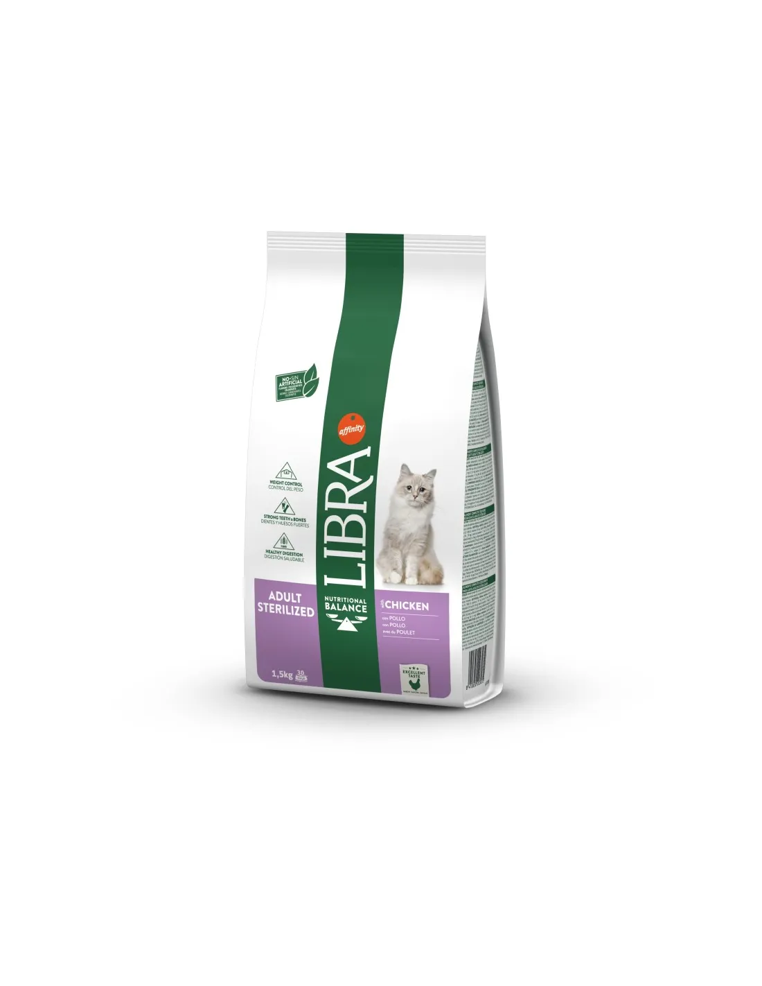 The product "Libra Sterilized Hairball Chicken" is a complete and balanced food specifically formulated for sterilized cats that tend to form hairballs. This food helps reduce the formation of hairballs and facilitates the elimination of ingested hair through the use of specific fibers.