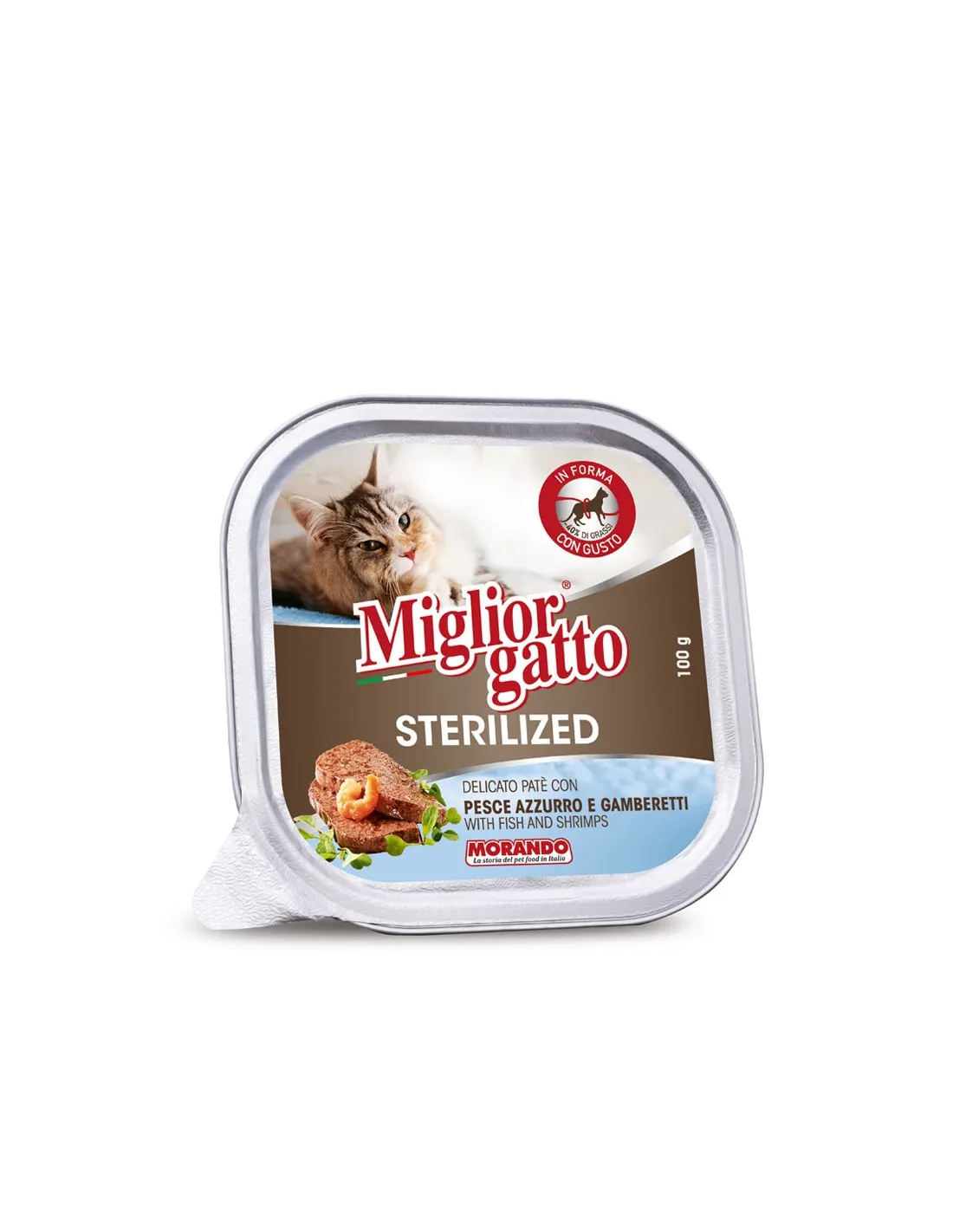The "Miglioratto Sterilized Delicato Patè with Blue Fish and Shrimps 100 g" is a complete and balanced food, specifically formulated for sterilized cats. Presented in the form of a pâté, this product combines meats and derivatives, fish and fish by-products, as well as molluscs and crustaceans, to offer a nutritious and hydrating meal. With 80% humidity, it ensures adequate hydration, while the oily fish and shrimp content enriches the diet with flavors that cats love.