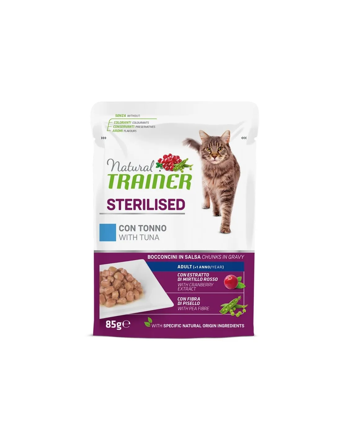 Cat Trainer - Multipack 4 sachets x 85 g Sterilized with Tuna is indicated for the daily feeding of sterilized adult cats. Its balanced formula is ideal for maintaining a healthy weight and supporting a healthy urinary system.