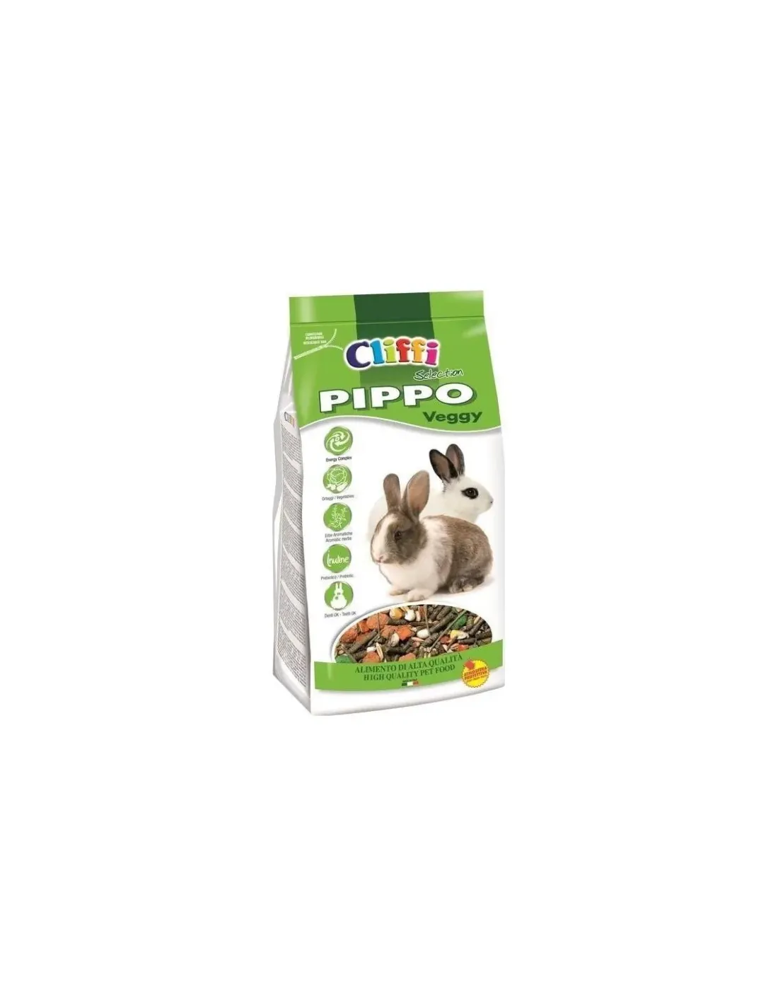 CARACTERÍSTICAS: PIPPO VEGGY es un alimento rico y apetitoso, para la felicidad de tus conejitos enanos. Aporta sustancias que encontrarían en la naturaleza y que son útiles para su bienestar. De hecho, contiene numerosas hierbas del campo deshidratadas (42%) que aportan fibra, una valiosa ayuda en la prevención de la obesidad y apoyo a una buena digestión; hortalizas (5,9%) ytallos de albahaca y perejil que aportan fibras largas ricas en silicatos, útiles para el correcto desgaste de los dientes y para la salud bucal; ENERGY COMPLEX, un ingrediente especial formulado por nuestros veterinarios, que contiene sales minerales y vitaminas, que apoya el sistema inmunológico y ayuda a limitar las deficiencias nutricionales; Inulinaque facilita la digestión y favorece el crecimiento de microorganismos intestinales beneficiosos, en detrimento de las bacterias consideradas nocivas. PIPPO VEGGY, como todos los alimentos de la línea CLIFFI, está envasado en atmósfera protectora (sistema STAY FRESH PACK), lo que ayuda a preservar la calidad y frescura natural del producto. BOLSA SELLABLE.