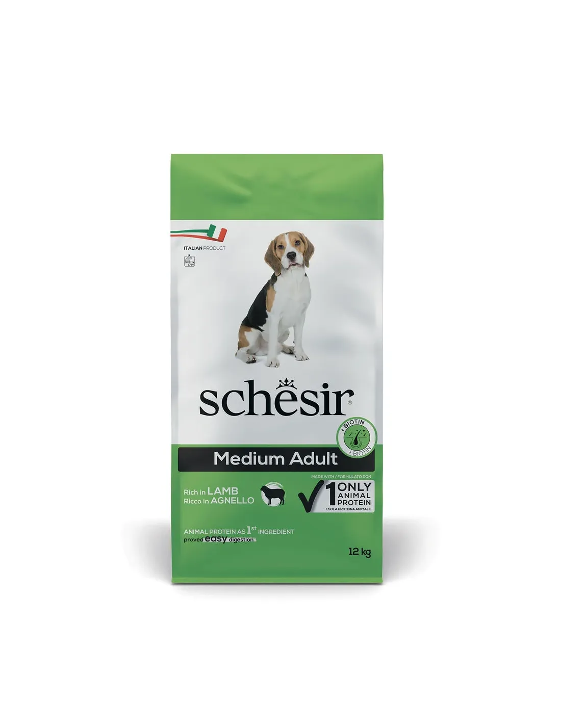 Schesir Dog Medium Adult Cordero Monoprotein Maintenance es un pienso de alta calidad para perros de tamaño mediano. Este producto ha sido cuidadosamente formulado para satisfacer las necesidades de mantenimiento diario de los adultos, con el cordero como única fuente de proteína animal, lo que lo hace ideal para perros con sensibilidad alimentaria. La capacidad de 12 kg garantiza un suministro duradero para tu fiel amigo de cuatro patas.