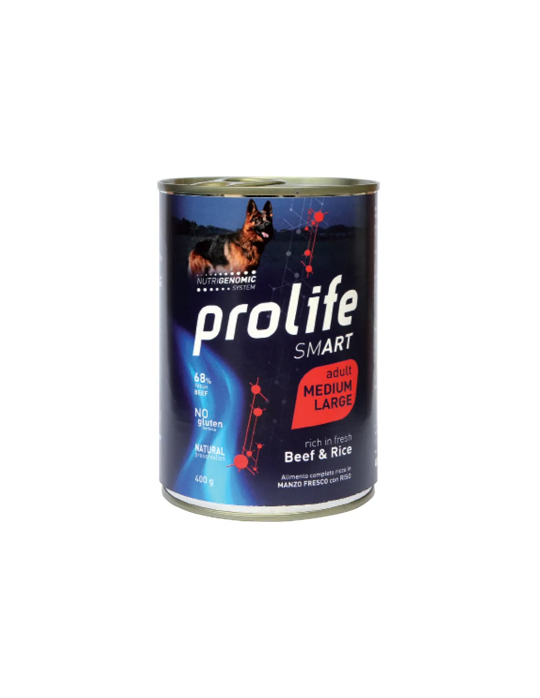 Prolife Dog Smart Adult Carne y Arroz - Mediano/Grande 400 g es un alimento completo y equilibrado, diseñado para cubrir las necesidades nutricionales de perros adultos medianos y grandes. Este producto destaca por su alto porcentaje de carne de vacuno fresca, que constituye el 68% de la composición total, garantizando un aporte proteico de alta calidad. El arroz, presente en un 4%, proporciona una fuente de carbohidratos de fácil digestión, contribuyendo al aporte energético diario necesario para el sustento de tu amigo de cuatro patas.