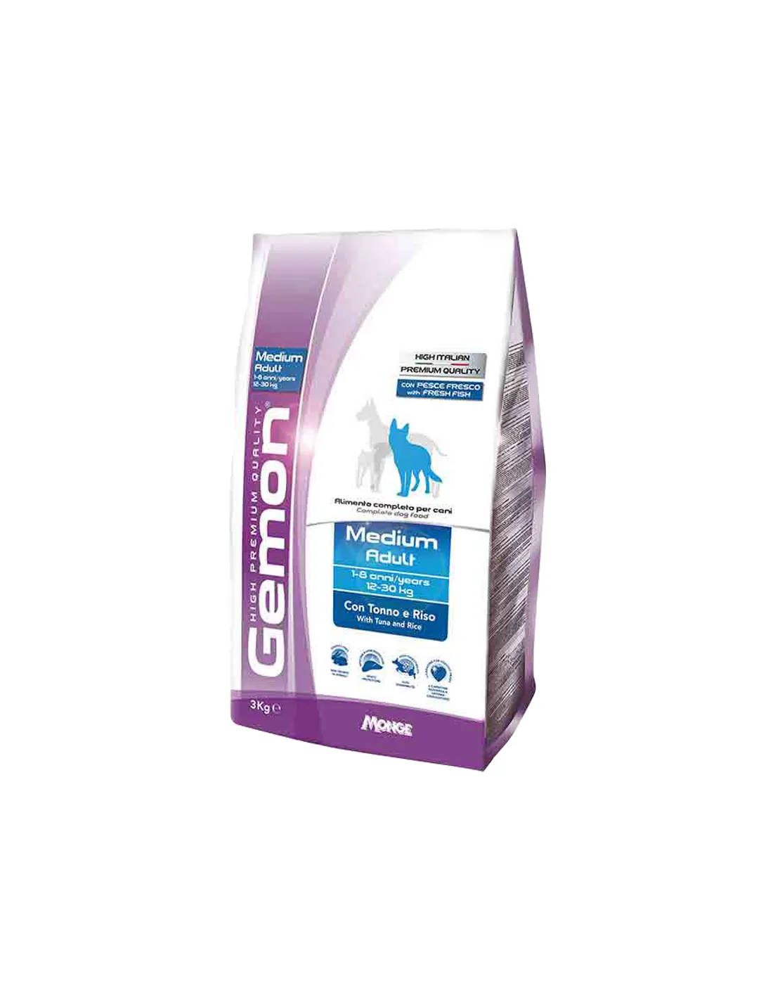 Gemon by Monge Medium Adult Atún y Arroz es un alimento completo para perros adultos de todos los tamaños. Este producto de alta calidad cuenta con ingredientes como el atún, que aporta nutrientes esenciales, y el arroz, fuente de carbohidratos de alta digestibilidad gracias al proceso de extrusión.