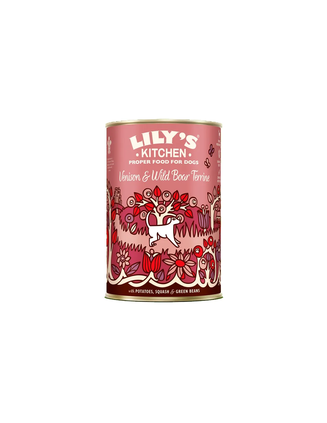 El "Lily's Kitchen - Terrina de Carne de Venado y Jabalí 400g" es un alimento húmedo completo e hipoalergénico para perros, formulado sin cereales y con ingredientes ecológicos. Esta receta exclusiva combina carne fresca de venado y jabalí con una selección de verduras y frutas orgánicas, enriquecida con botánicos beneficiosos y aceite de cáñamo, conocido por sus ácidos grasos esenciales.
