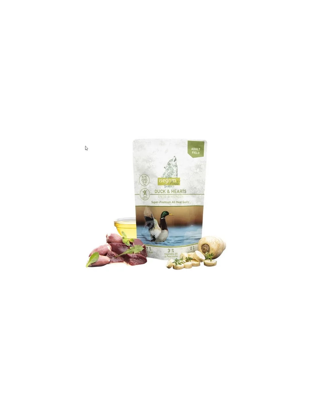 La composición de ISEGRIM ROOTS PATO Y CORAZONES ha sido diseñada para reflejar al máximo la dieta natural del lobo, con un alto porcentaje de carne y caldo. La receta incluye: