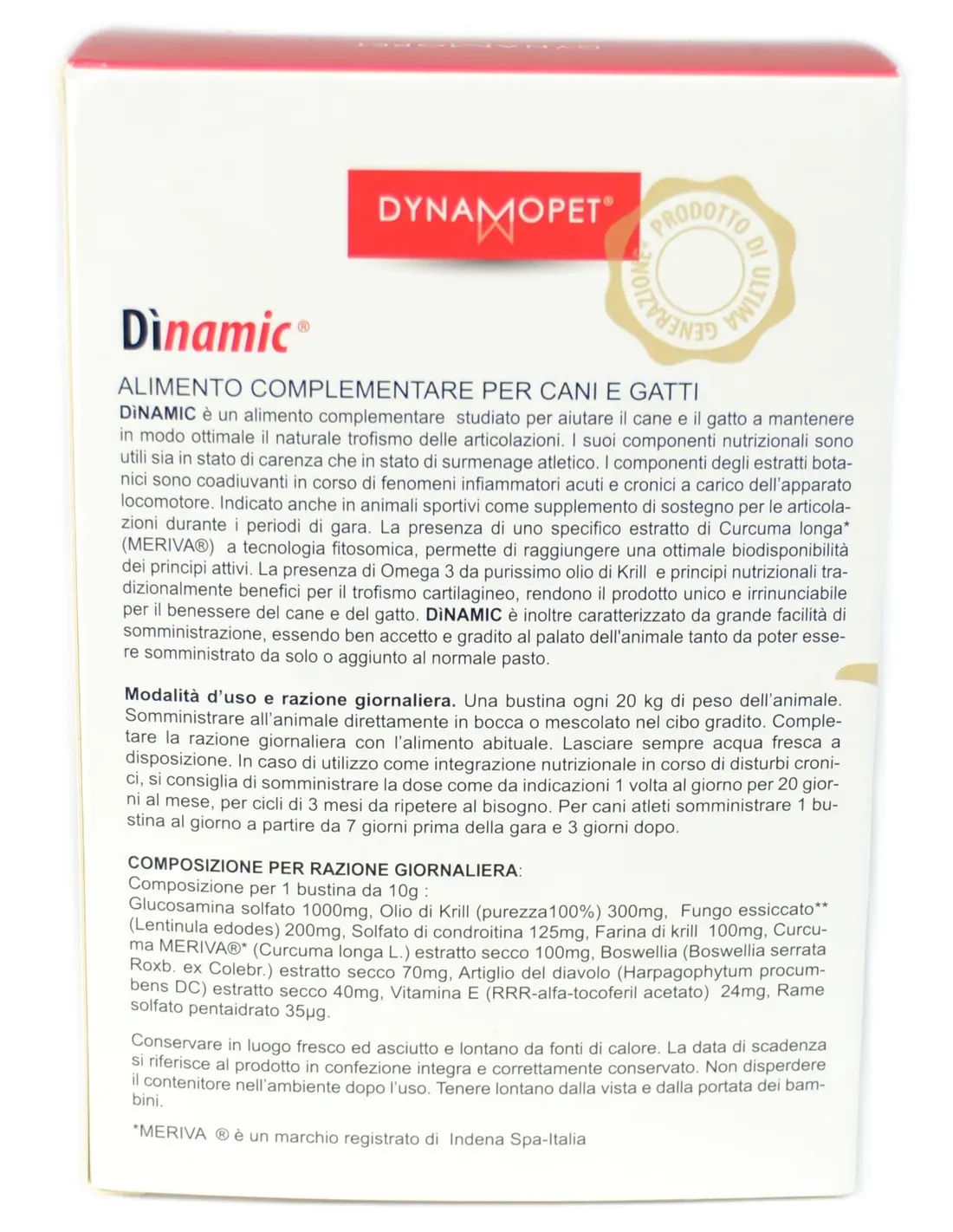 DìNAMIC es un alimento complementario diseñado para ayudar a perros y gatos a mantener de forma óptima el trofismo natural de las articulaciones. Sus componentes nutricionales son útiles tanto en estado de deficiencia como en estado de sobreedad atlética. Los componentes de los extractos botánicos son coadyuvantes durante los fenómenos inflamatorios agudos y crónicos que afectan al sistema musculoesquelético. También indicado en animales deportivos como complemento de apoyo a las articulaciones durante los periodos de competición. La presencia de un extracto específico de Curcuma longa (MERIVA®) con tecnología fitosomal permite conseguir una biodisponibilidad óptima de los principios activos. La presencia de Omega 3 procedente del aceite puro de Krill y de principios nutricionales tradicionalmente beneficiosos para el trofismo cartilaginoso hacen que el producto sea único e indispensable para el bienestar de perros y gatos. DìNAMIC se caracteriza también por una gran facilidad de administración, siendo bien aceptado y apreciado por el paladar del animal, hasta el punto de que puede administrarse solo o añadido a la comida habitual.Dosificación