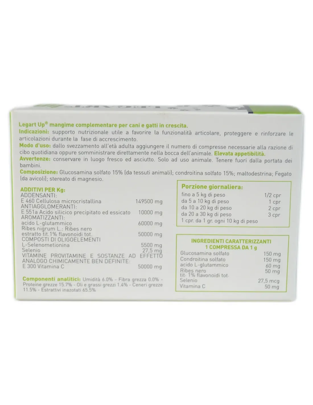 Es un soporte nutricional útil para favorecer la funcionalidad y el desarrollo del sistema esquelético durante la fase de crecimiento de perros y gatos, útil también, con fines preventivos, en adultos de riesgo en los que aún no han aparecido signos clínicos de artrosis. Legart Up es un complemento alimenticio en comprimidos masticables para cachorros y gatitos, a base de Glucosamina, Sulfato de Condroitina y Vitaminas, está recomendado para fortalecer el cartílago articular de perros y gatos durante la fase de crecimiento, al ser coadyuvante de las articulaciones favorece el desarrollo articular armonioso, previniendo la aparición de patologías y asegurando un desarrollo óseo natural y controlado.