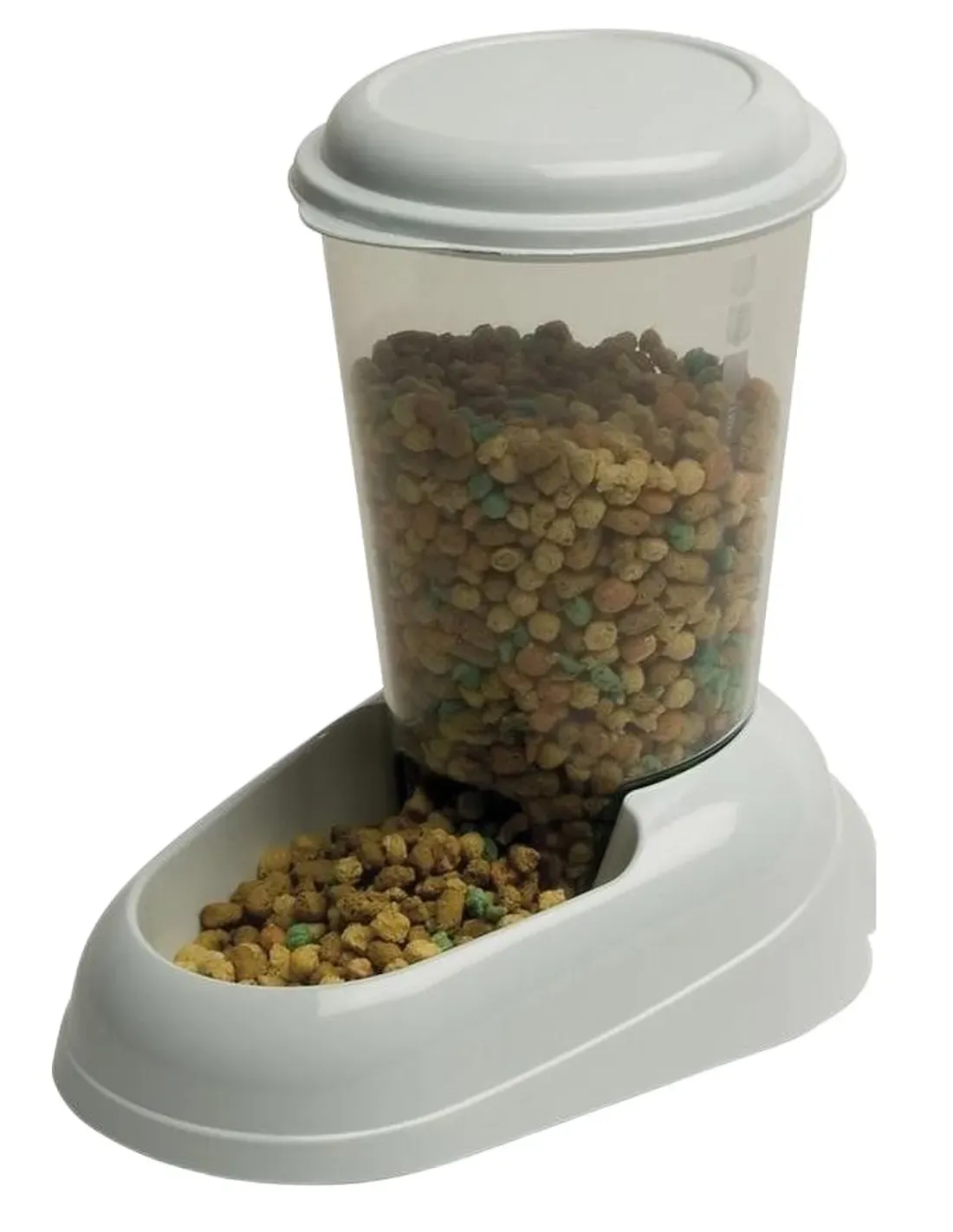 Gracias al dispensador de comida para perros y gatos Zenith, tu fiel amigo podrá disfrutar de su croqueta favorita en cualquier momento. Fabricado íntegramente en plástico, Zenith dispone de un depósito transparente que permite mantener siempre bajo control el nivel de alimentos contenidos en su interior. Zenith es ideal tanto para gatos como para perros pequeños y medianos, tiene capacidad para 3 litros de comida seca y está equipado con un práctico asa y tapones de goma antideslizantes.