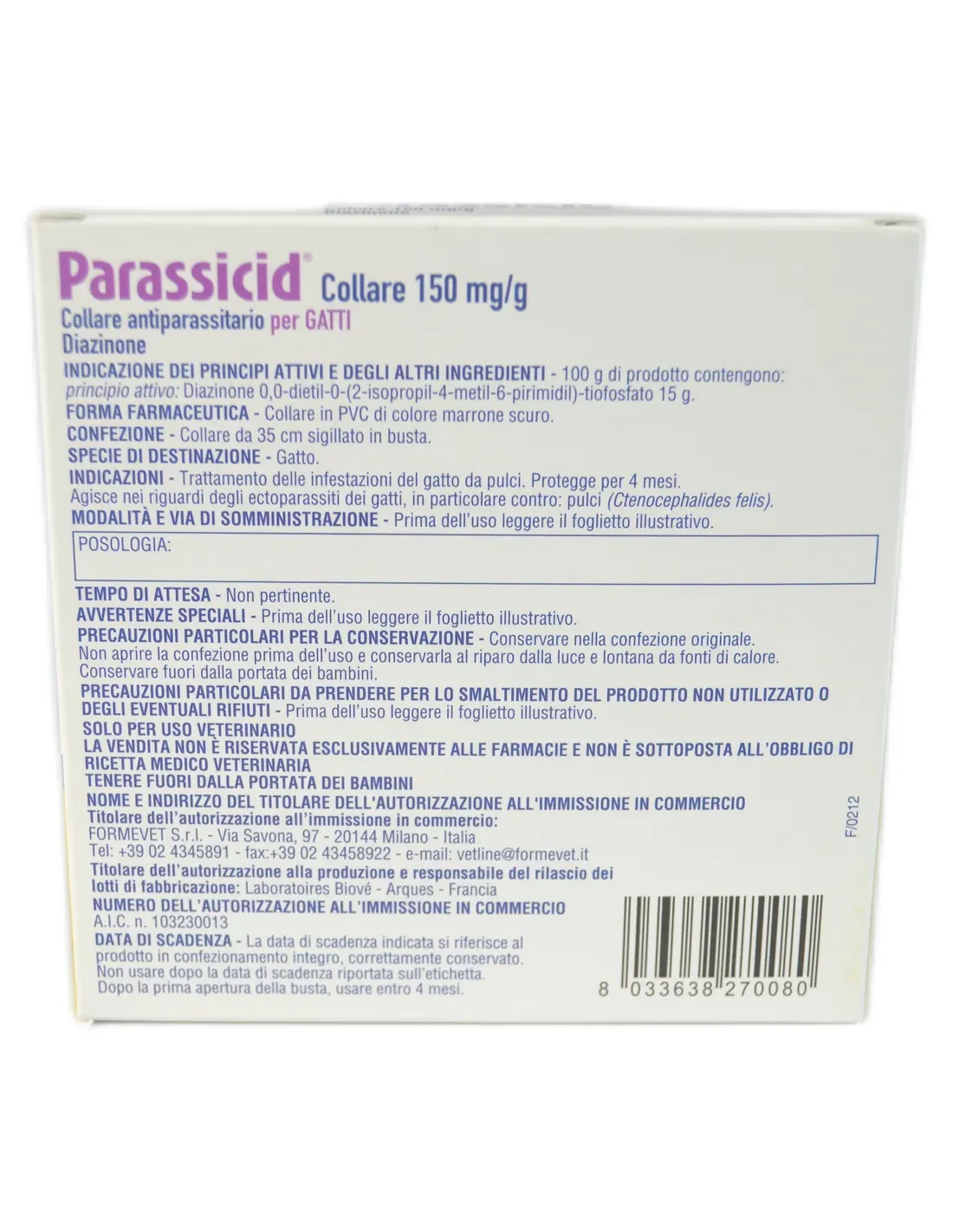 Un collar por mascota. Gato: la aplicación de un collar de 35 cm a gatos que pesen entre 2,5 y 7 kg equivale a una dosis de entre 6 y 3,21 mg de diazinón/kg de peso corporal/día. El collar, debido a las características particulares del principio activo, no teme la humedad ni pierde actividad en el agua o la lluvia. El collar garantiza protección hasta por 4 meses. Para más información consultar el prospecto.