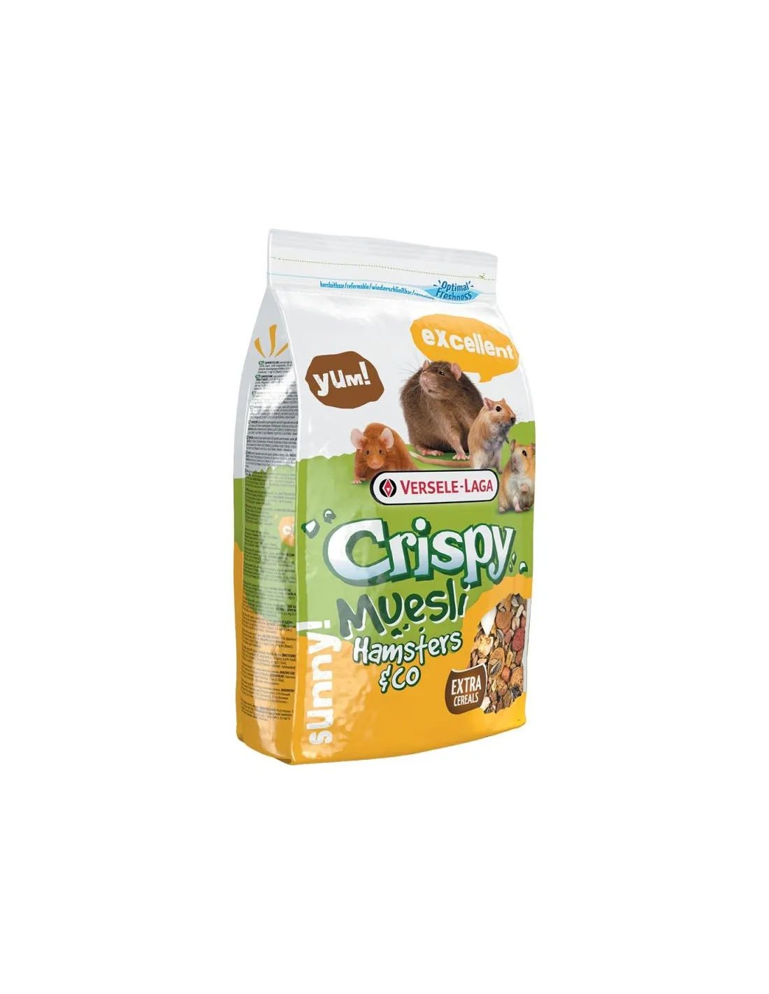 Versele Laga Crispy Muesli Criceti & Co. 1kg es un alimento completo y de alta calidad para hámsteres, jerbos, ratas y ratones. Es una mezcla rica en energía, enriquecida con el pellet "Happy & Healthy" para una salud óptima. Su composición incluye una variedad de ingredientes nutricionales, incluidos cereales, verduras, semillas, nueces, frutas, extractos de proteínas vegetales, sustancias minerales, aceites y grasas, azúcares. El producto pesa 1.020 kg y se suministra en un práctico paquete que conserva la frescura.