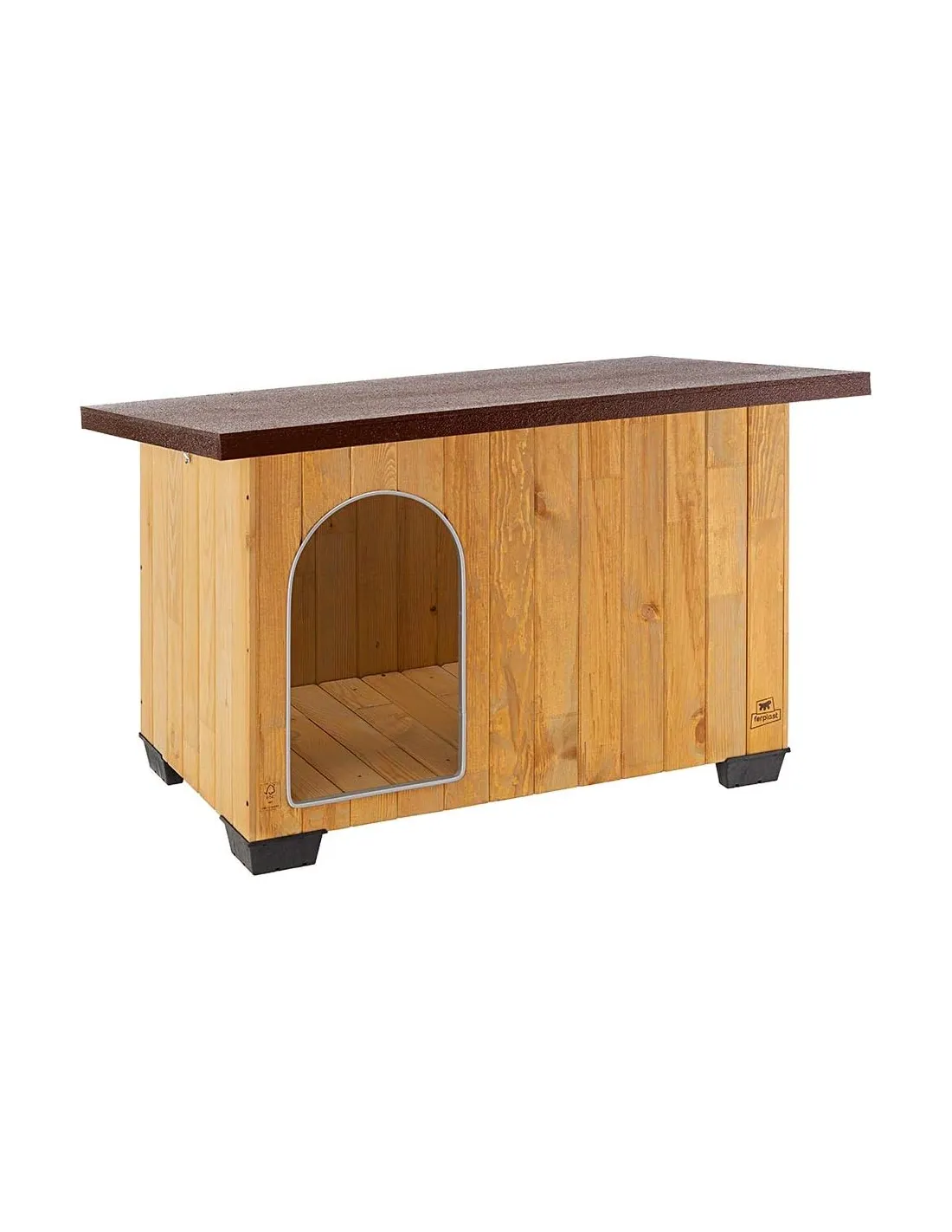 La cabaña tiene una construcción particular con un techo ligeramente inclinado para permitir el correcto drenaje del agua de lluvia. Como todas las casetas para perros de madera de Ferplast, es ideal para exteriores, además tratada tanto interior como exteriormente con particulares procesos de pintura para garantizar la máxima durabilidad y resistencia a cualquier condición climática. De hecho, la madera está protegida gracias a una pintura impregnante ecológica, atóxica, antimoho y resistente a los rayos UV. y repelente al agua, aplicado mediante tecnología flow-coating.