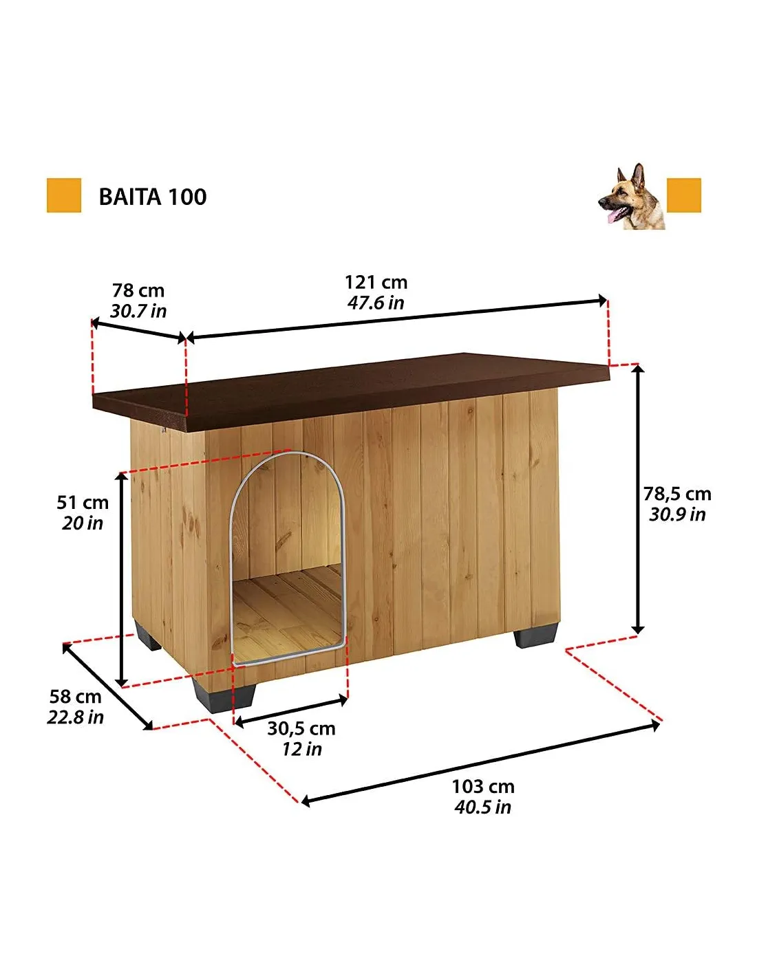 Baita está equipada con pies de plástico que permiten mantenerla perfectamente aislada del suelo. La puerta de entrada de la perrera, colocada lateralmente para una mayor protección de los agentes atmosféricos, tiene un particular revestimiento de aluminio anti-mordidas. Un gancho metálico especial asegura la fijación del techo a la caseta y al mismo tiempo permite abrirla para las operaciones de mantenimiento diario.
