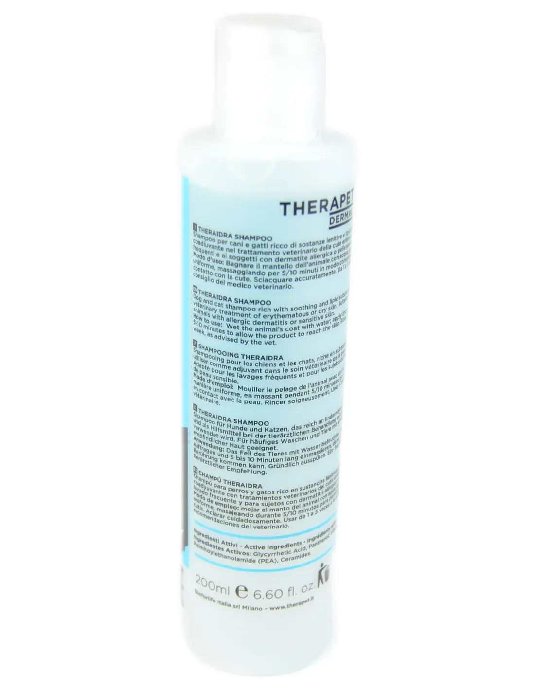 tèraidra es un champú con una delicada acción limpiadora indicado para personas con piel sensible o que padecen dermatitis alérgica. Los principios activos de teraidra hacen que el champú sea ideal para el lavado frecuente de animales con piel normal, para evitar la deshidratación, así como para el lavado de animales con piel sensible y deshidratada, con tendencia a enrojecerse, o animales que padecen dermatitis alérgica. Limpia, hidrata y protege la delicada piel, reduciendo el eritema y el picor asociados a la dermatitis.