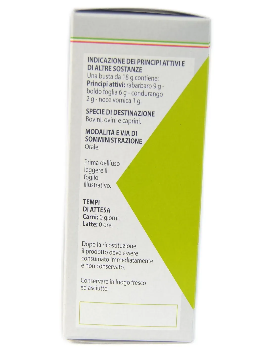 Administrar por vía oral, disuelto en líquidos calientes, antes de la ración alimenticia. Bovino adulto: 18 g (1 sobre) a repetir 3 veces al día. Como purgante: 54 g (3 sobres) por la mañana y 54 g (3 sobres) por la noche. Terneros, ovinos y caprinos: 9 g (½ sobre) a repetir 3 veces al día. Como purgante: 27 g (1 sobre y ½) por la mañana y 27 g (1 sobre y ½) por la noche. Administrar inmediatamente después de la reconstitución del producto.