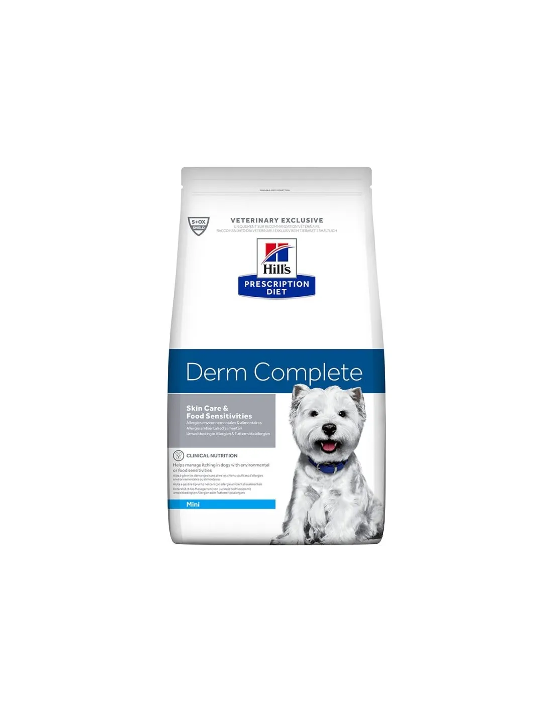 Hill's - Prescription Diet Canine - Derm Complete es un producto seguro para su uso en perros. Está clínicamente probado y formulado para reforzar la barrera cutánea contra los irritantes ambientales.