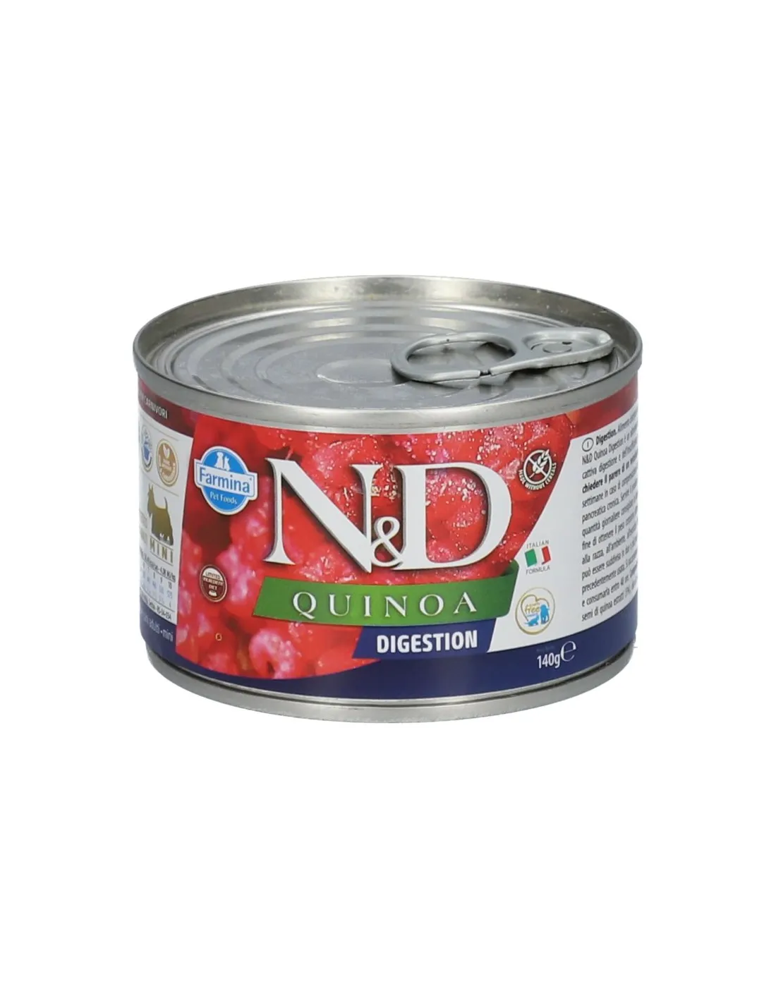 N&D Quinoa Digestion es un alimento dietético completo para perros adultos, diseñado para compensar las malas digestiones y la insuficiencia pancreática exocrina. Formulado con ingredientes de alta calidad como cordero, quinoa, hinojo, menta y alcachofa, favorece el bienestar digestivo de tu perro.