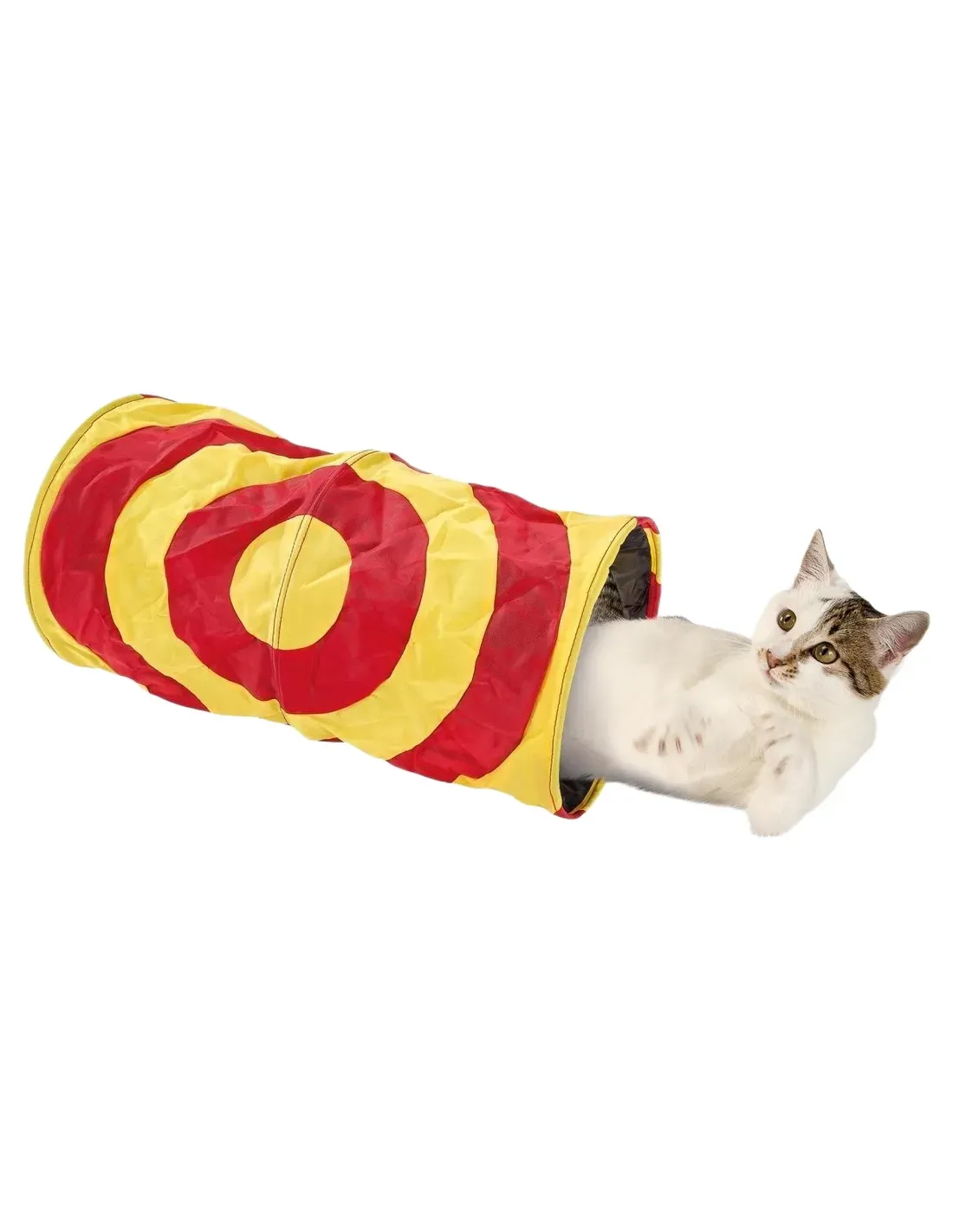 Te presentamos un juego de agility para gatos en forma de túnel con dos cómodas salidas, fabricado en poliéster con estructura interna. El túnel es ideal para mantener a tu amigo en excelente forma, también útil como antiestrés para amenizar los momentos de aburrimiento. Al pequeño felino le intrigará: podrá utilizarlo para tender emboscadas y esconderse en su interior, o simplemente como refugio para descansar plácidamente en varios momentos del día. Una vez cerrado, el túnel es realmente compacto y, por tanto, ideal para llevarlo contigo en varias ocasiones.