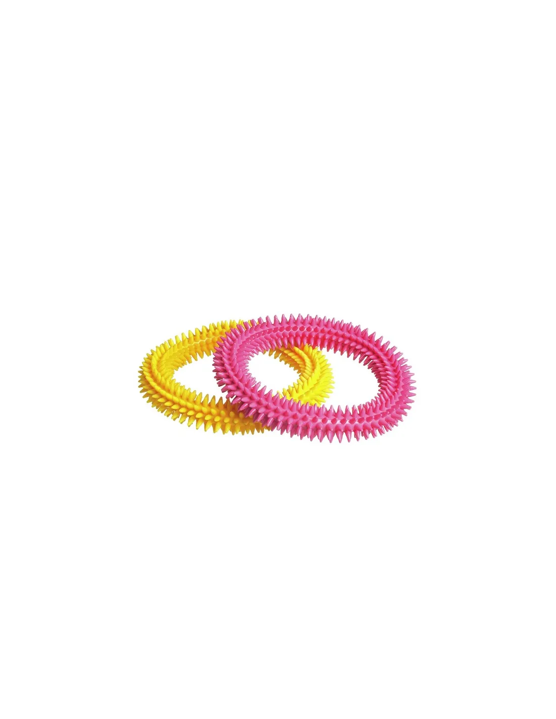 Las puntas de la superficie del anillo han sido cuidadosamente diseñadas para proporcionar un suave y agradable masaje en las encías, contribuyendo así a la salud bucal del perro. Estas cerdas actúan como un cepillo de dientes mientras masticas, ayudando a eliminar la placa y los restos de comida de los dientes y las encías, promoviendo un aliento más fresco y previniendo la formación de sarro.