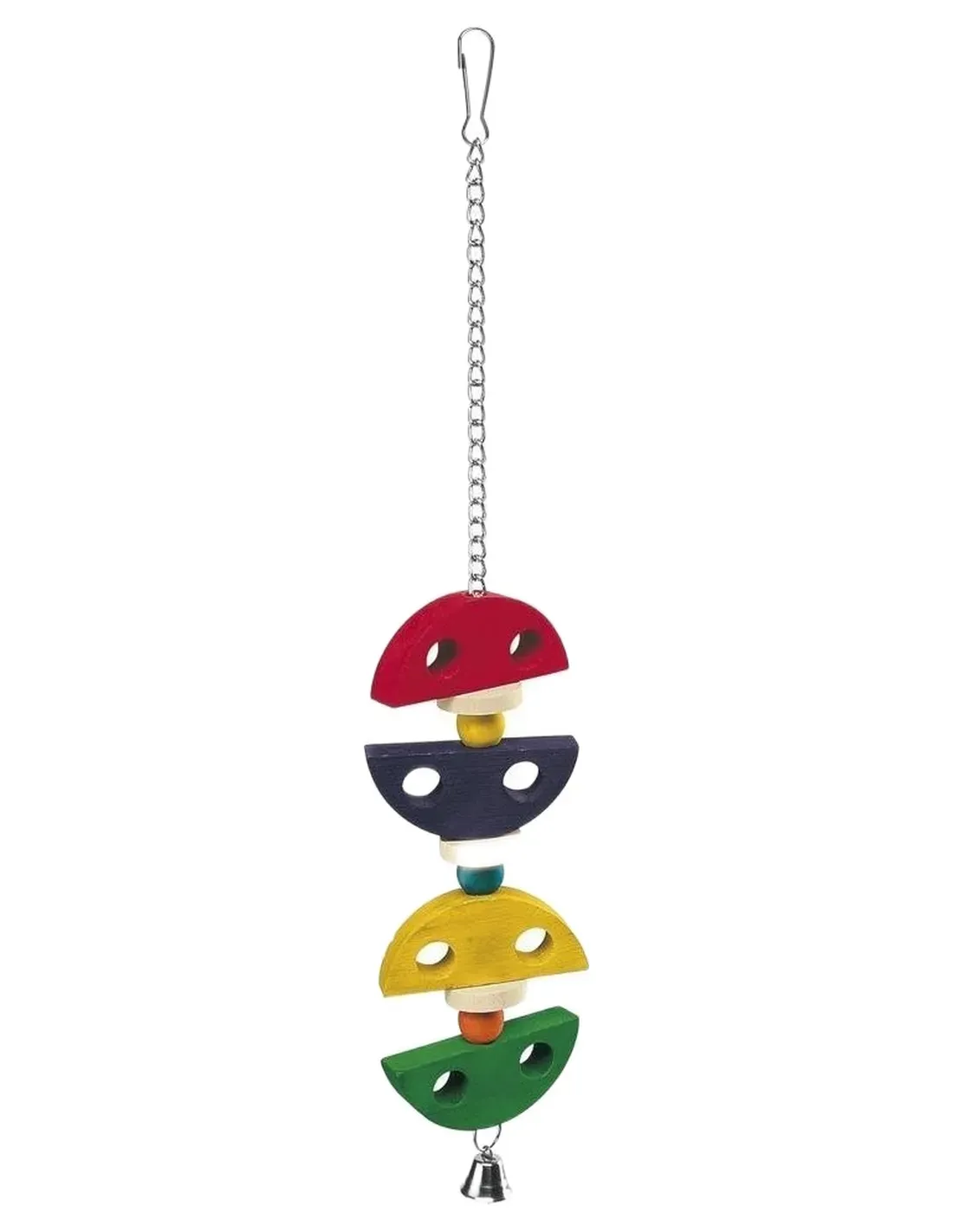 PA 4095 es un juguete colgante de madera para loros y cacatúas, que forma parte de una línea de pasatiempos dedicada a ellos. ¡Ideal para brindar momentos de alegría a nuestros amigos emplumados! Muy coloridos y con formas imaginativas, estos juegos están equipados con una o más campanas y una cadena de metal con gancho para permitir una práctica fijación a la jaula. Centradas en el bienestar total de tus mascotas, las pinturas utilizadas para colorear la madera son completamente atóxicas.