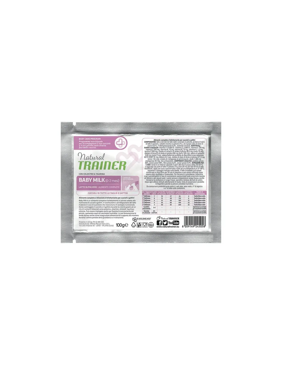 Natural Trainer Leche Bebé 100 gr es un alimento complementario en polvo, diseñado para cubrir las necesidades nutricionales de cachorros de perros y gatos durante los dos primeros meses de vida. Este producto ha sido cuidadosamente formulado para asegurar un aporte equilibrado de nutrientes esenciales, garantizando así un crecimiento sano y armonioso de las pequeñas mascotas. Su composición ha sido diseñada para ser lo más parecida posible a la leche materna, proporcionando un soporte óptimo durante la fase de destete o en ausencia de leche materna.
